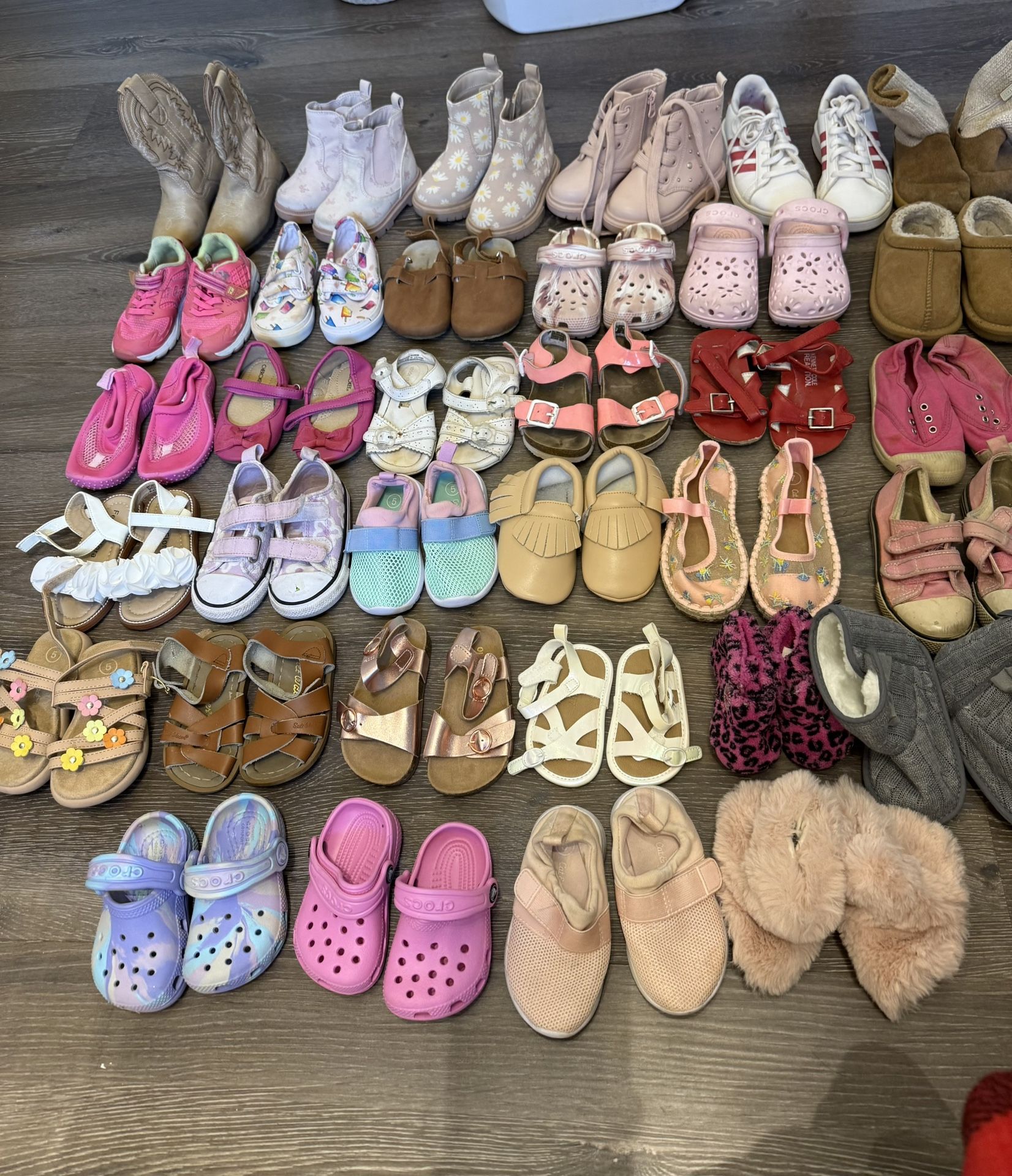 Lots of baby girl shoes from 0 to size 7c that fits to newborn up to 2 to 3 years old,and there’s only 1 piece of size 11 that fit to 4-5 years old. There are 4 crocs in there’s , boots, adidas , vans , swim shoes, converse , Cherokee , etc. 34 pieces for $80. Will hold for Venmo Also have lots of baby girl clothes 3-6m,3-9m,12-18m,24m/2t,4t/5t Also have baby hats, hairpins/head bows, socks , Velcro swaddle,bibs, mittens, car seat cover, nursing cover , baby carrier , sleeps sacks, rainbow mat,towels , burp clothes, etc.
