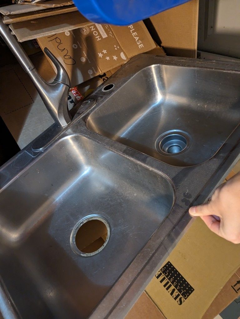 Used stainless steel double bin, double drain sink with faucet. Faucet has a sprayer setting and can be pulled out to reach farther. Roughly 31"L, 22"W Pick up in Black Diamond (Kentlake Highlands)