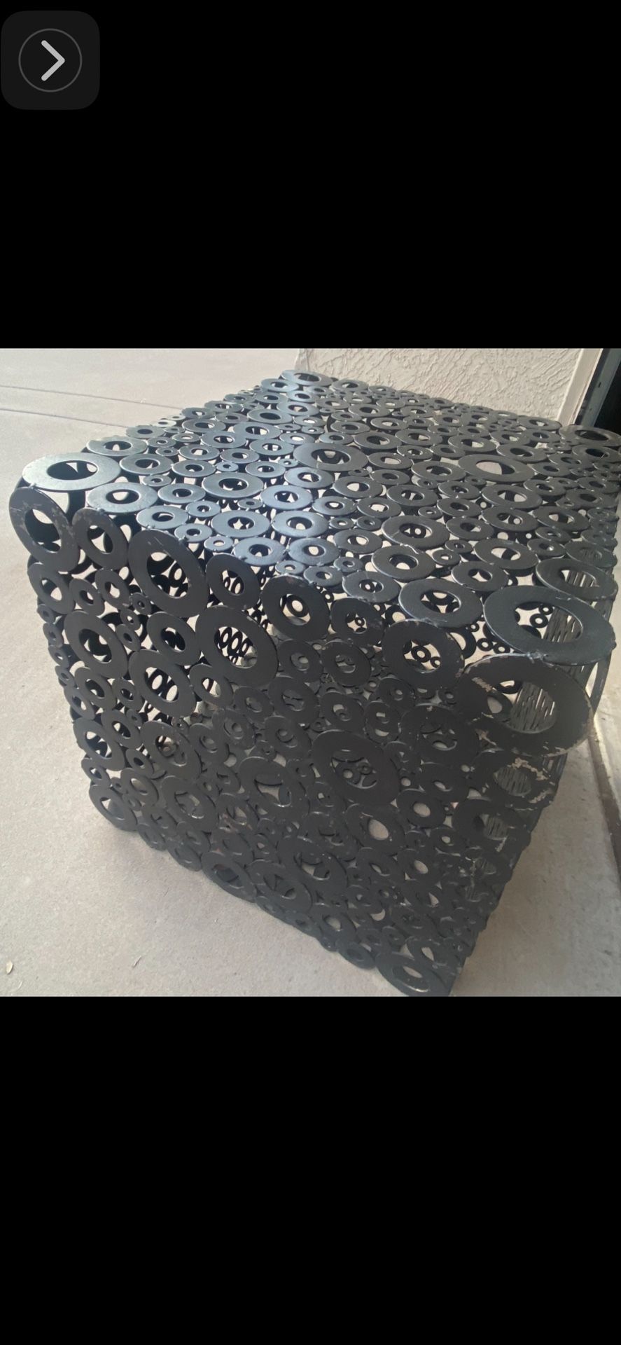 24" x 24" x 24" handmade thousands of sautered steel rings make up these unique tables that are beautiful, especially with backlighting. would look so cool painted a great color $175 each pick up in scottsdale near the 101 and frank lloyd wright