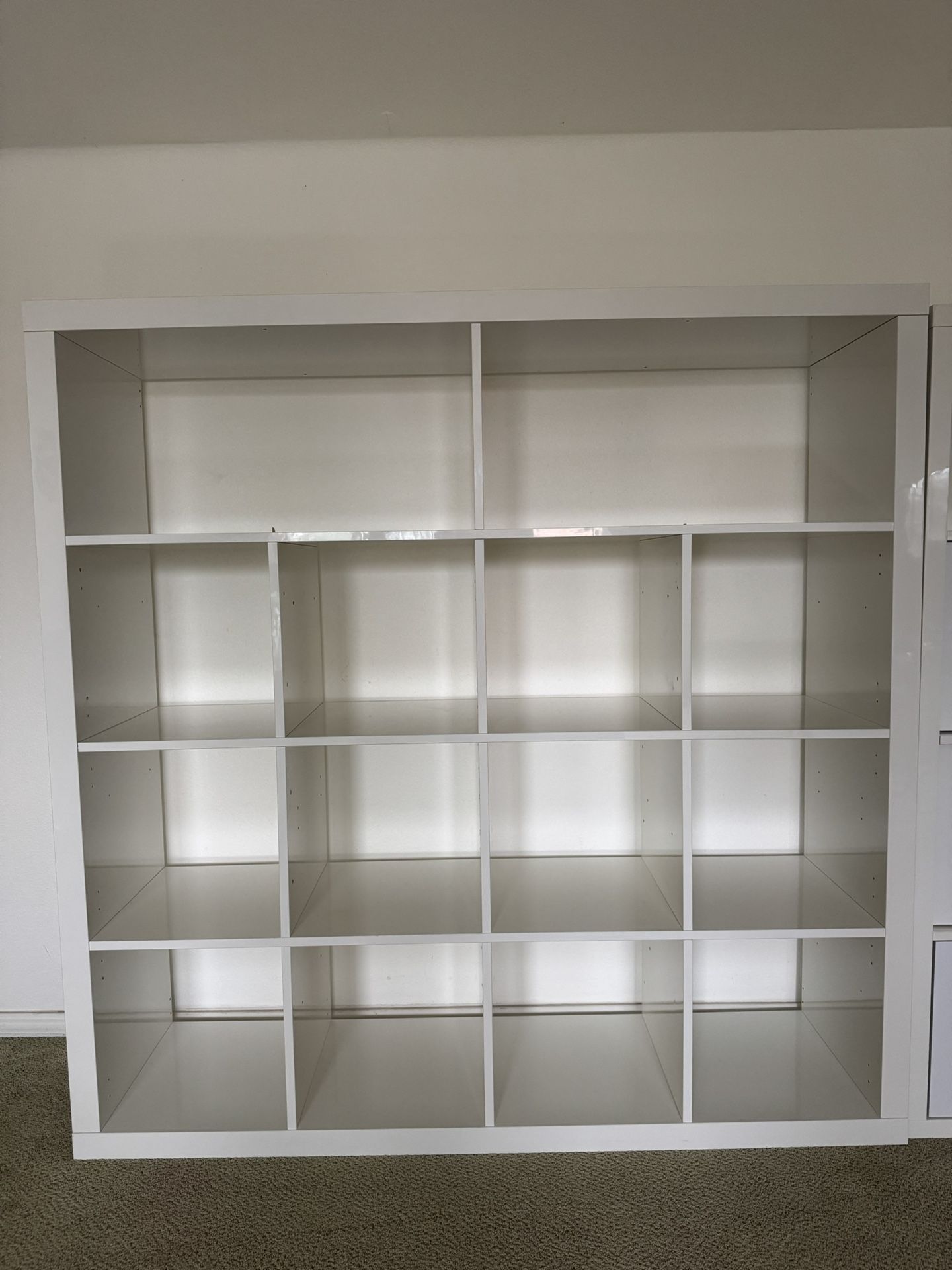 Good Condition ~ IKEA Kallax / Expedit 4X4 Cube Shelf Unit First 3 pictures is what we have. Originally installed 12 insert with mirror doors $60 Also, $30 for 12 Mirror Door units available Pick up required