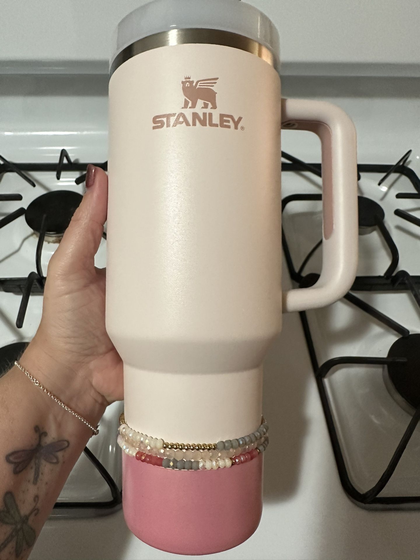 New Stanley 40oz tumbler in rose quartz. Comes with boot and charms