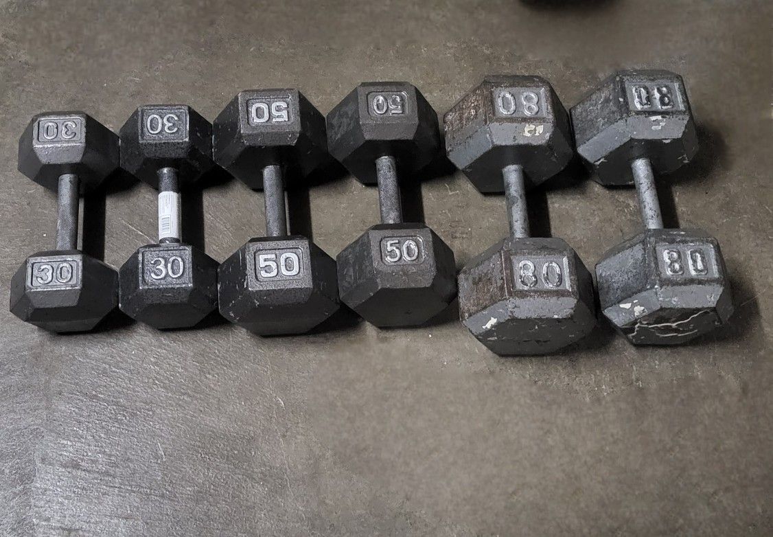 2-30, 2-50 and 2-80 pound dumbells,one of the 80 s is a little loose on one end,selling all for $150 thanks for looking