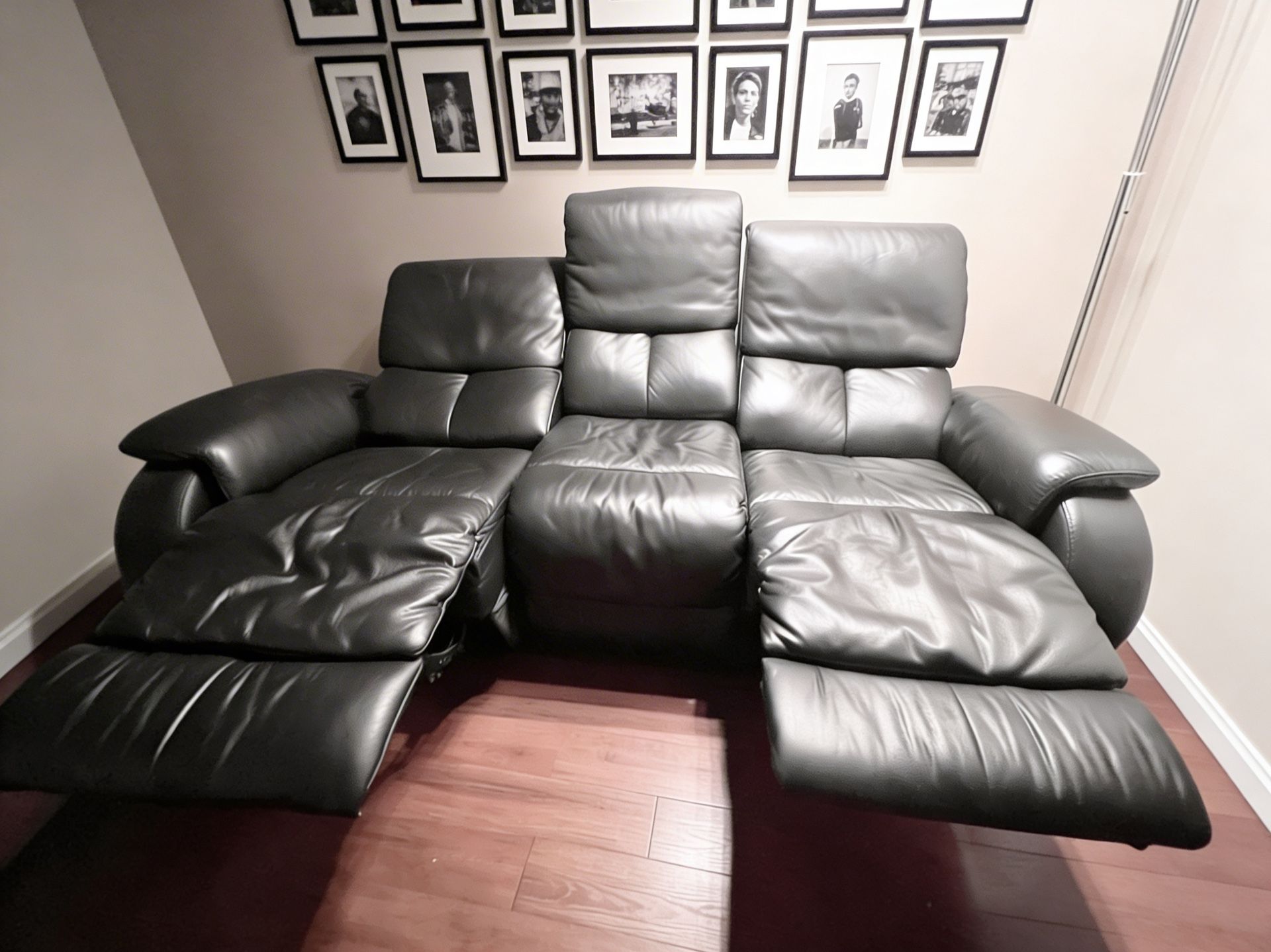 Sleek black leather reclining sofa with a clean, modern profile and exceptionally comfortable feel. Designed with wide, cushioned arms and supportive high backs, this piece features dual reclining seats on both ends—perfect for relaxing, lounging, or movie nights. The leather has a soft, supple finish with natural creasing that adds character while maintaining a polished look. A versatile statement piece that works effortlessly in both modern and transitional spaces. • 3-seat sofa with dual recliners • Smooth, easy reclining mechanisms • Soft, durable black leather upholstery • Structured yet comfortable support Well cared for and in great overall condition.
