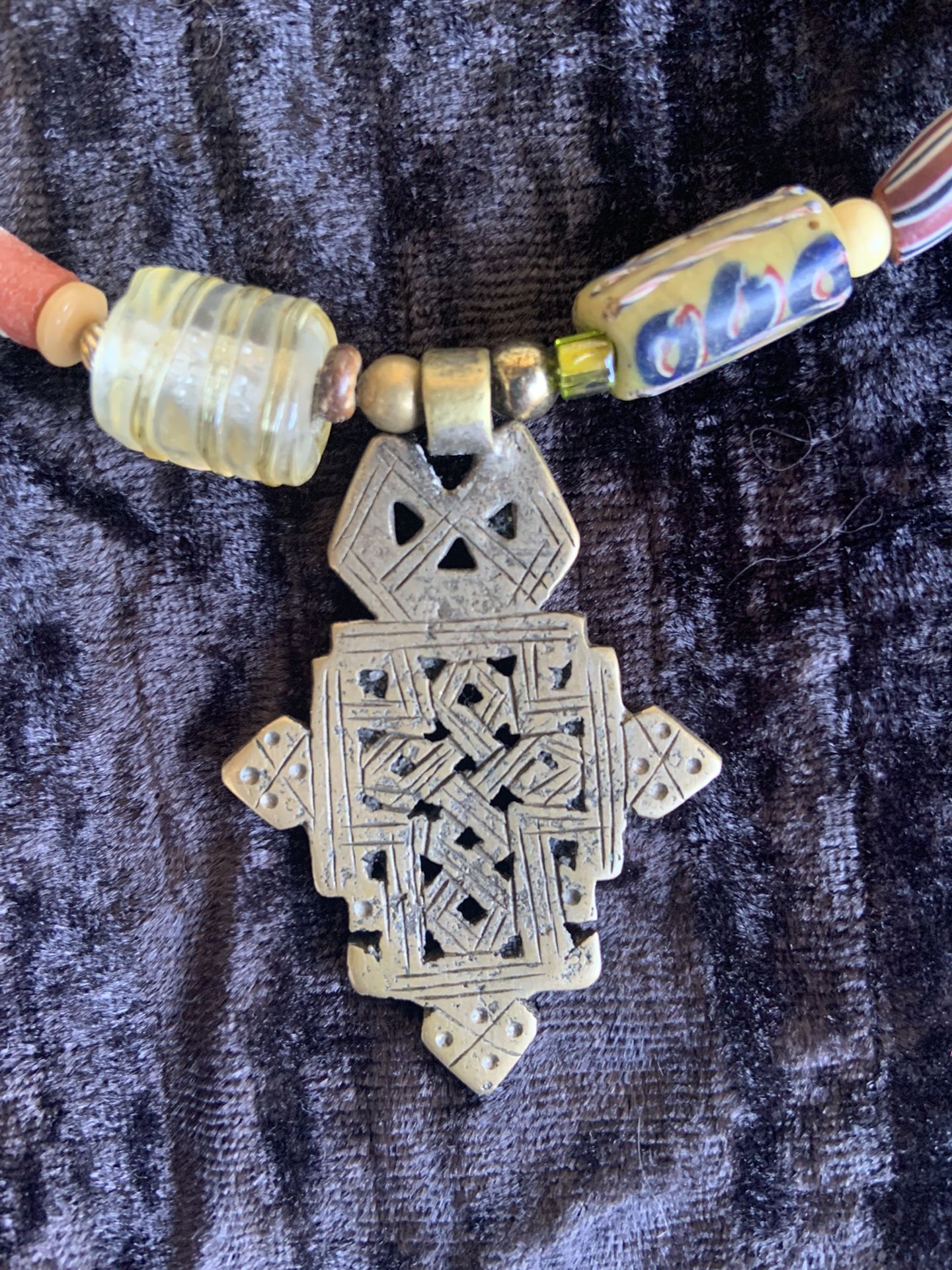 This gorgeous fusion of African, Russian and Egyptian cultures is a wearable piece of art! It features an antique Ethiopian Coptic cross pendant as the centerpiece and includes vintage, rare and antique African trade beads, Ugandan paper beads and giraffe bone beads, Russian handcrafted clay beads, a vintage Egyptian scarab as well as Egyptian glass beads, shells and Czech crystals and glass. It hangs 13” (26” total length) or 15” with pendant.