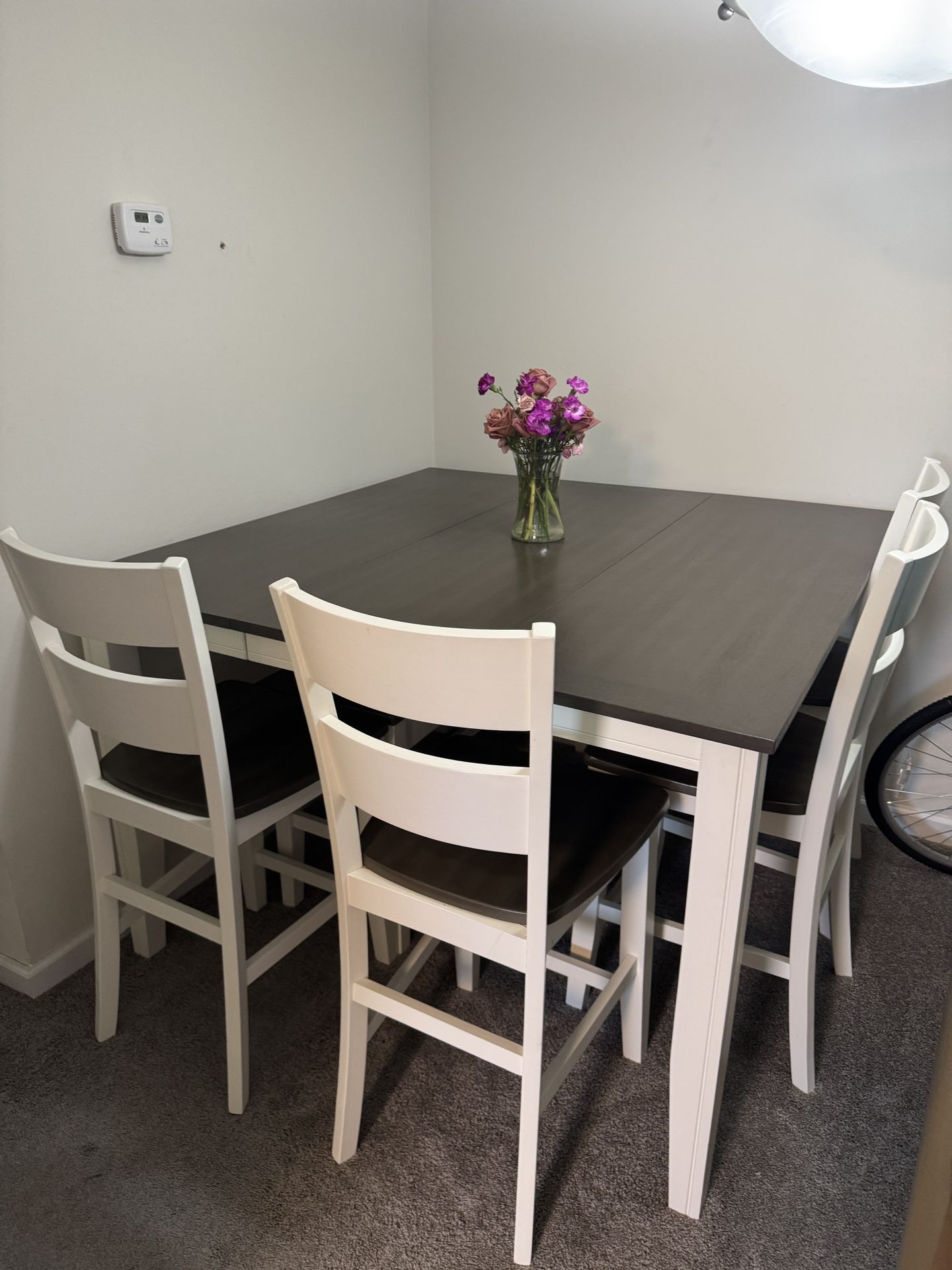 Bob’s Furniture Blake 6 Piece White & Gray Extendable Counter Height Dining Set with Storage Bench. In excellent condition, we’d love to take it but don’t have space. Complete with four counter stools, storage bench and a counter table that includes an 18'' leaf so you can expand the table length from 36'' to 54'' in an instant! Set includes: counter table, 4 stools, and storage bench Photo has bench hidden under table, we are in the process of moving so could not picture it at its usual spot.