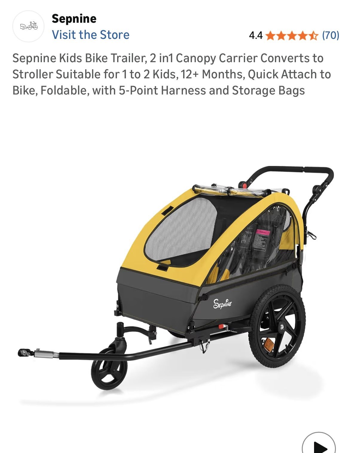 Sepnine Kids Bike Trailer, 2 in1 Canopy Carrier Converts to Stroller Suitable for 1 to 2 Kids, 12+ Months, Quick Attach to Bike, Foldable, with 5-Point Harness and Storage Bags