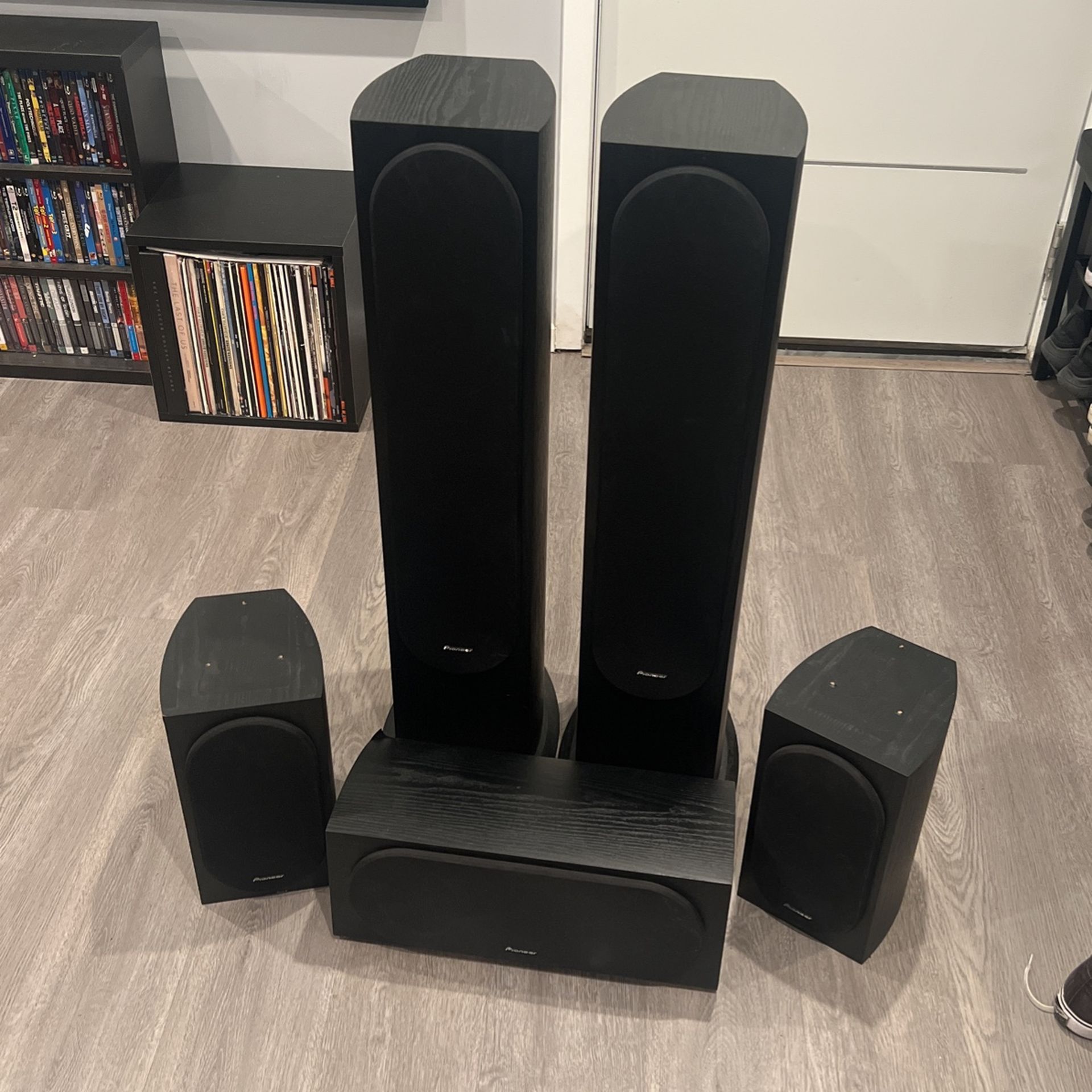 A pretty kick ass sounding set for a surround sound system. Served me well for many years. They sound great and still work just like day 1. The front 2 floor standing speakers are in good condition, kept pretty clean and damage free. The center has a tiny corner peeling off, and the surrounds have some paint on the back and tiny drill holes for mounting. Includes the surround mounting kits as well. A great bargain price for entry 5.1 systems.