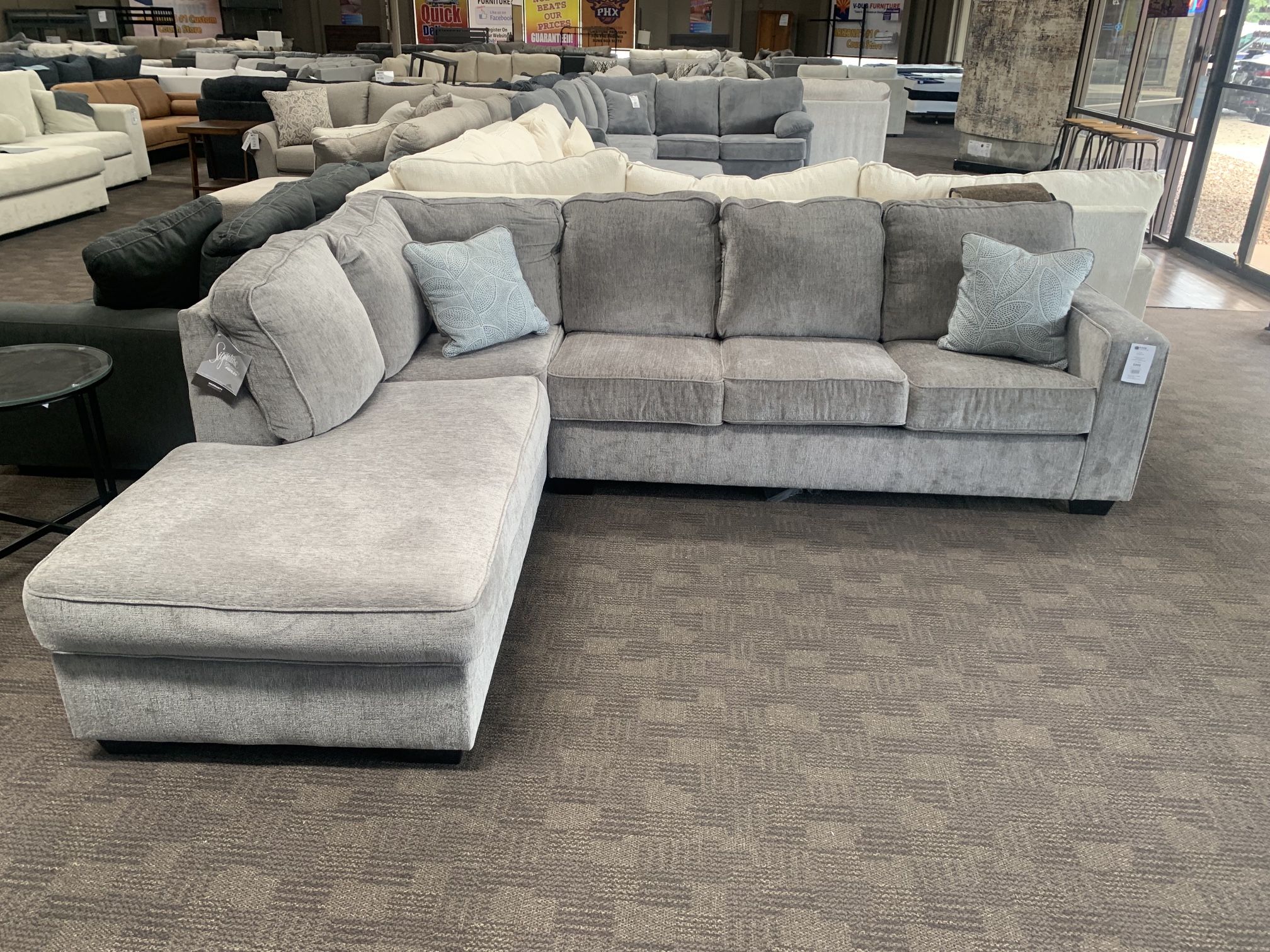 Brand new sectional. Soft dark grey fabric. Attached back pillows help keep its shape nice and clean. Pick up or have it delivered. Payment plans available