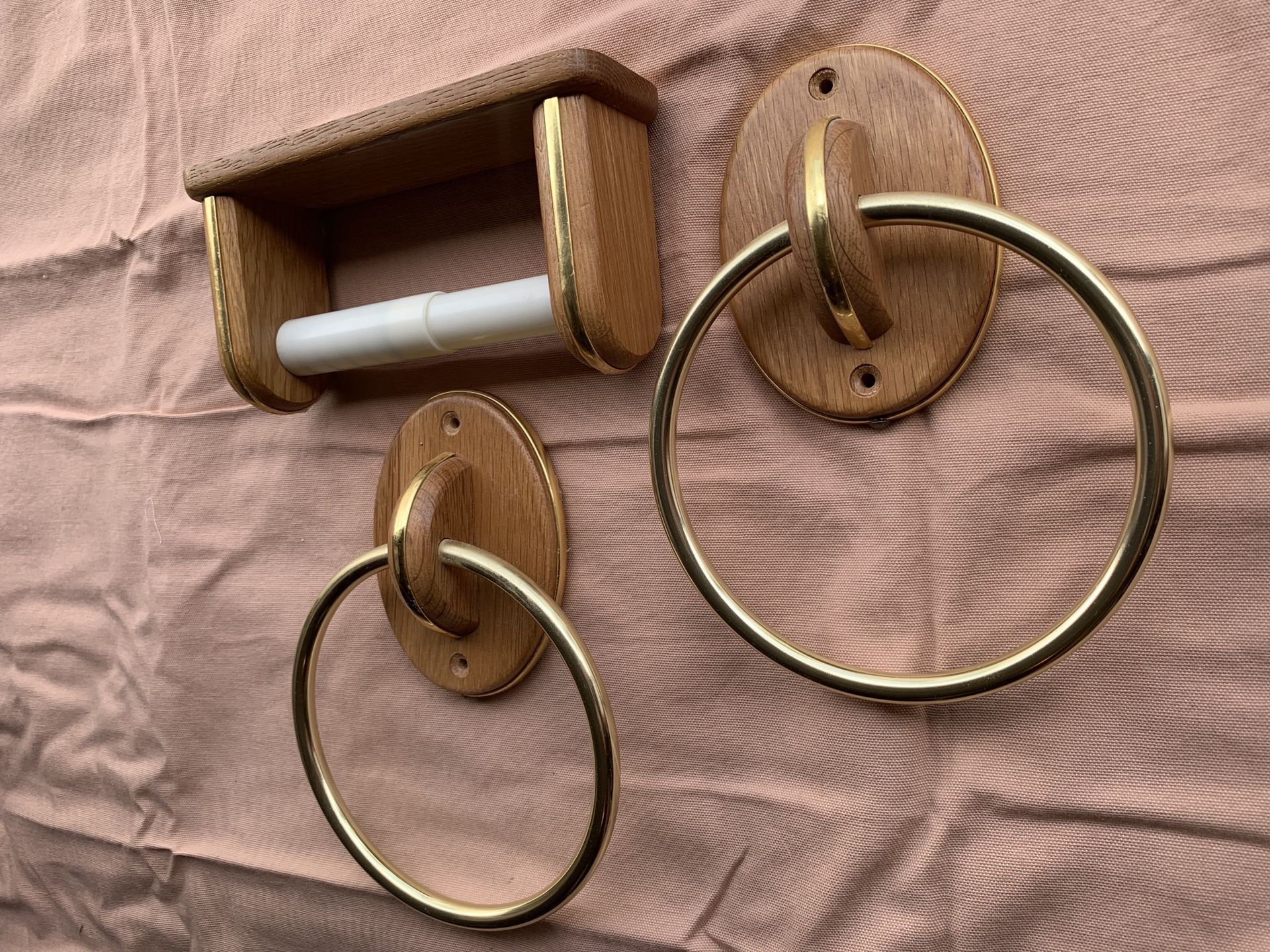 Wood base with gold detailing. Great condition, normal wear/use. 2 towel holders, 1 tissue dispenser.