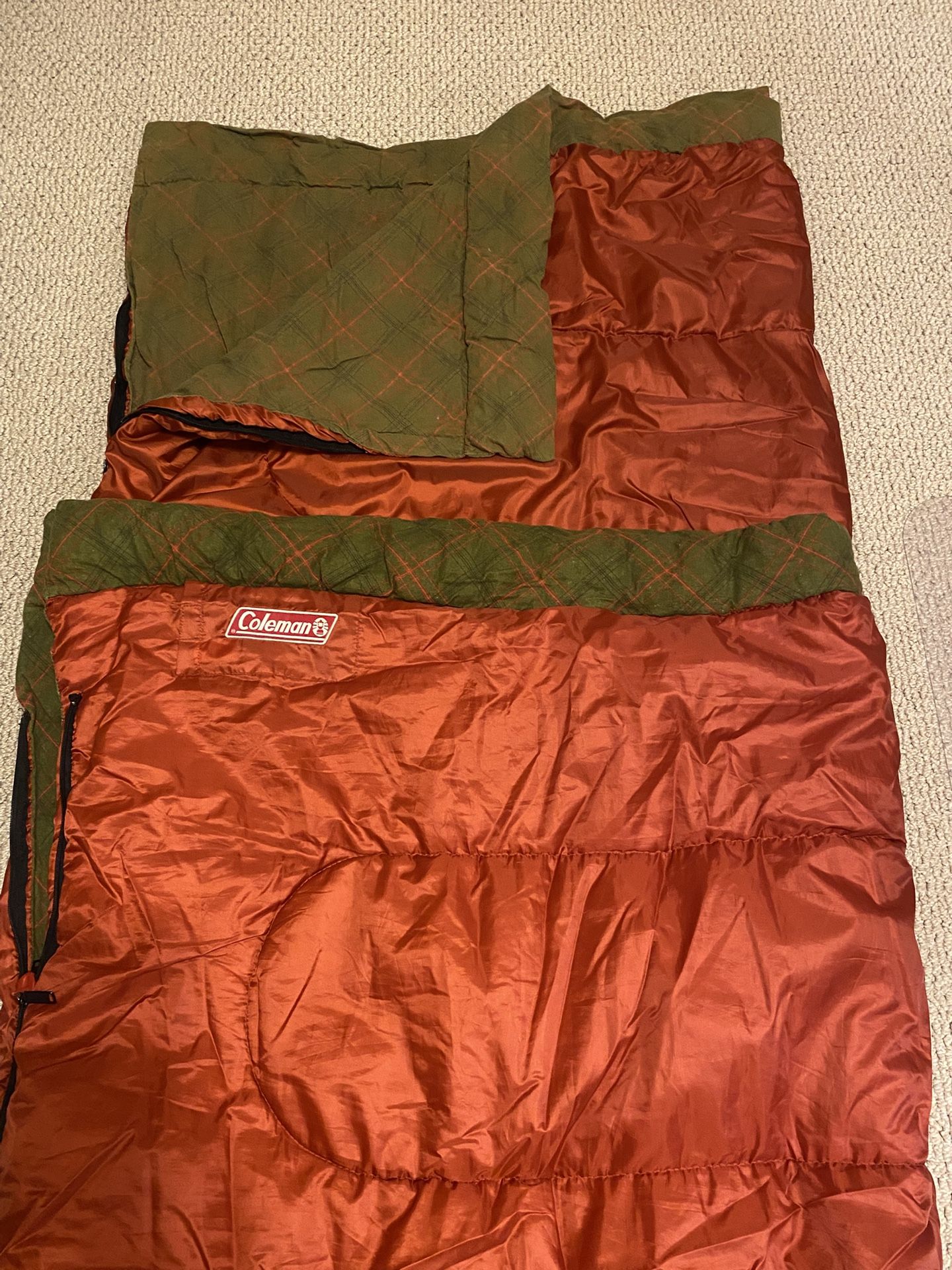 Includes both bags Almost new condition, used inside for sleepovers 75" x 33" Polyester cover and flannel inside 40°F 4 lb. carry weight Tie cords for easy rollup Machine washable