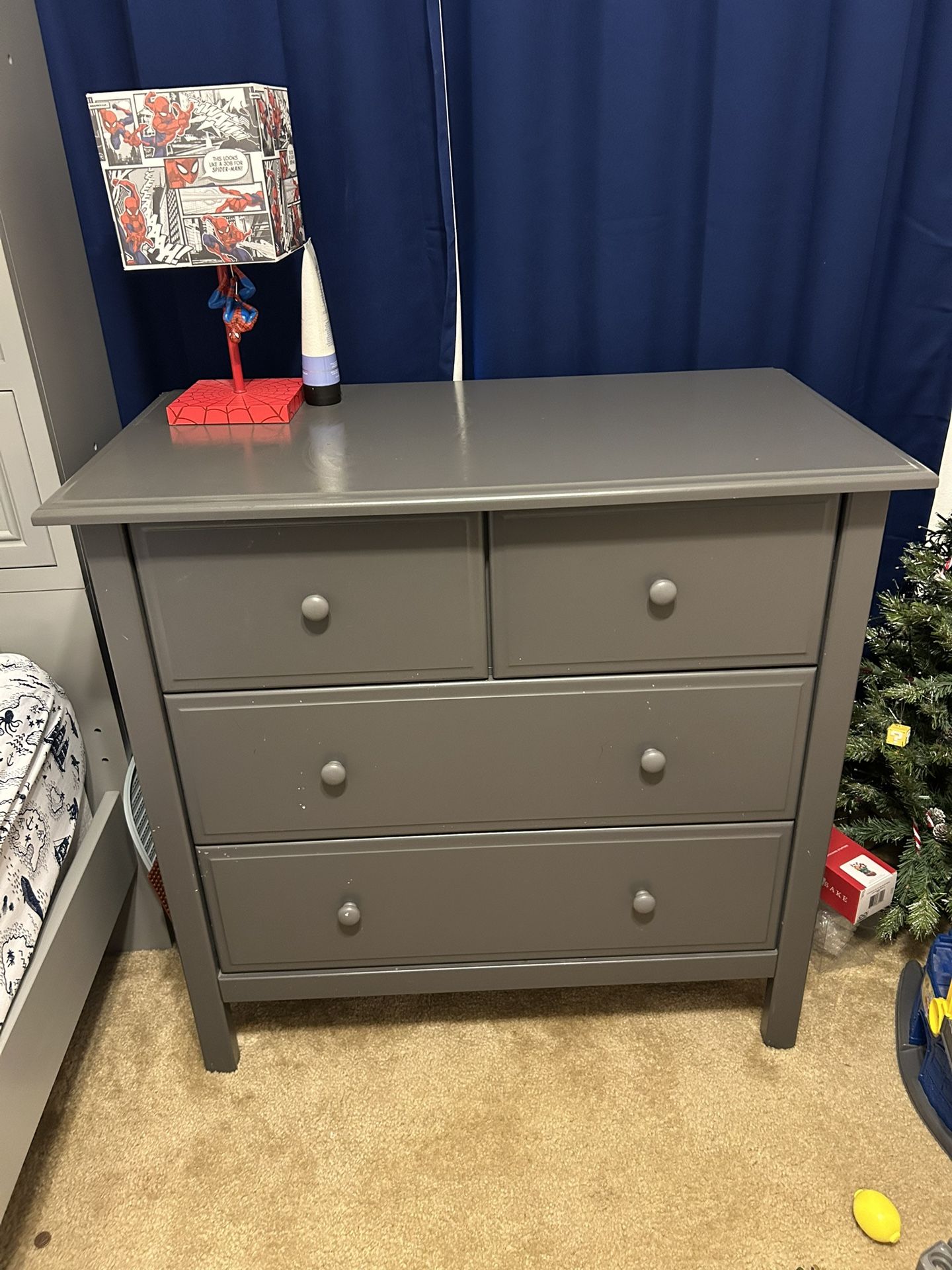 4 Drawer Dresser in grey. Top and body look good from any major scratches minus the left back corner which is lightly dinged and the top has a small spot. Needs to be cleaned up and the white spots will come off the front. Drawers work great and have stoppers from coming all the way out. One knob keeps falling off, still threads on so maybe just add some glue to keep it from slipping off. Asking 45