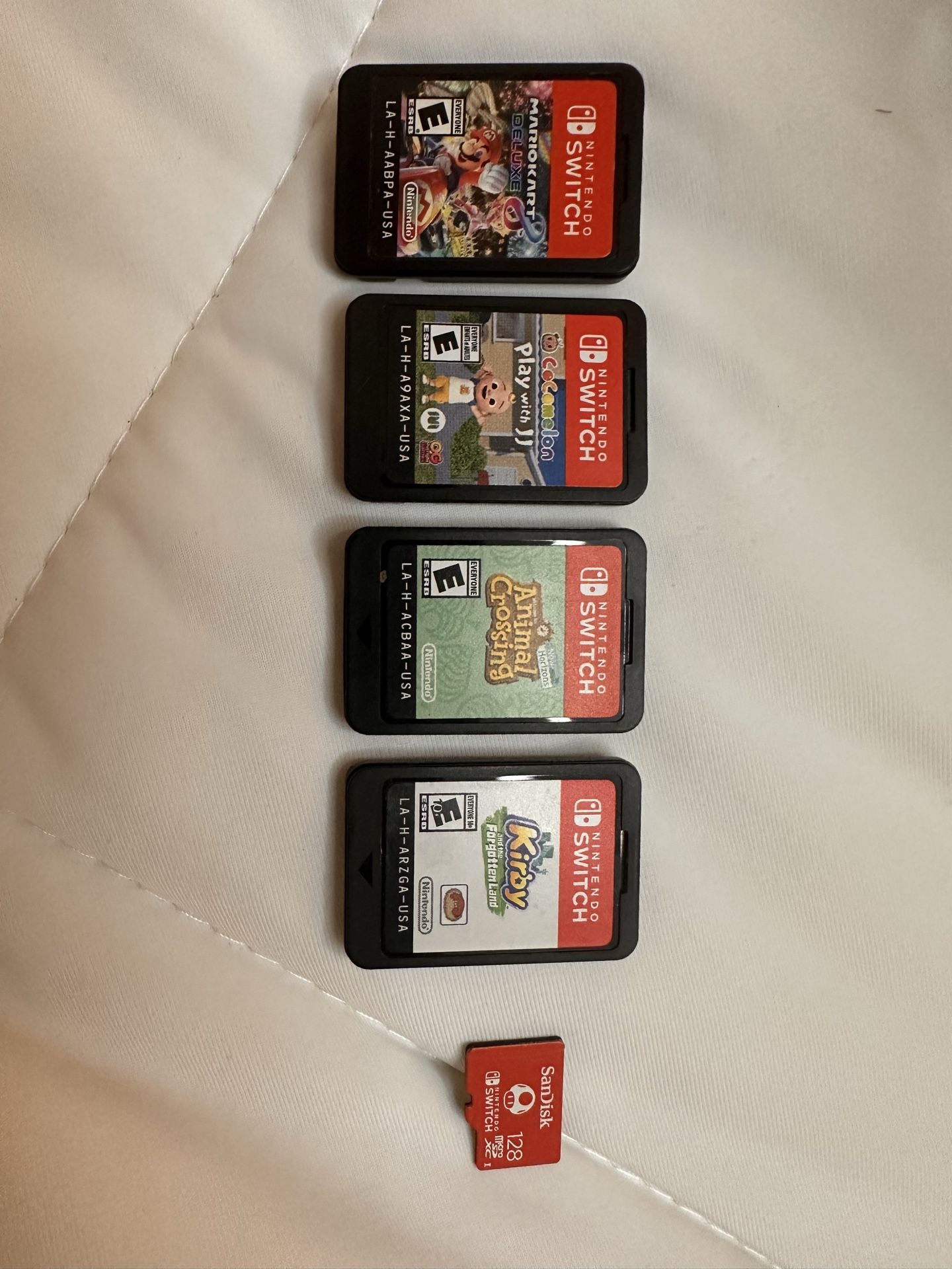 Nintendo Switch Games for sale: 1. Mario Kart 8 $45 (With Case) 2. Animal Crossing $45 (Loose) 3. Kirby & the Forgotten Land $50 (With Case) 4. Cocomelon $20 ( With Case) 5. 2x SD Card 128gb $20 each Nintendo DS games: 1. Pokemon Pearl - $50 2. Mario Kart DS - $50 Located in Fremont. PRICES FIRM (unless bundled).
