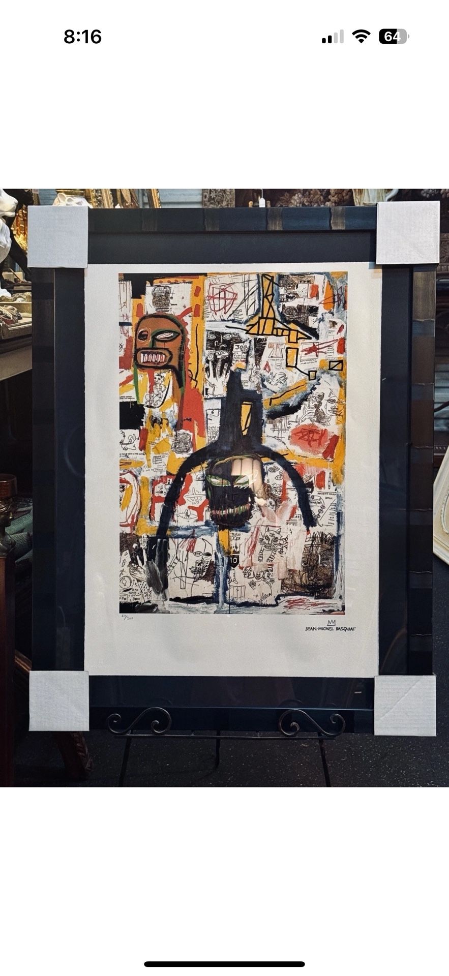 Jean-Michel Basquiat – “Famous Moon King” Add a bold contemporary statement to your space with Jean‑Michel Basquiat’s “Famous Moon King”, a limited edition offset print, hand‑numbered 60/300, and plate‑signed. This edition is printed on embossed Sundance archival paper, giving the artwork a textured, premium gallery feel. The piece is professionally framed and measures 26.75 x 34.75 inches, making it a standout focal point for modern interiors, studios, offices, or collectors of Basquiat’s iconic urban aesthetic. The reverse label (JBW2188) confirms the edition and catalog reference. Features: • Title: Famous Moon King • Artist: Jean‑Michel Basquiat (offset reproduction) • Medium: Offset print on embossed Sundance archival paper • Edition: Limited Edition 60/300 • Signature: Plate‑signed • Paper: Embossed Sundance watermark • Frame Size: 26.75 x 34.75 inches • Catalog Label: JBW2188 • Display: Professionally framed with corner protectors Condition: Excellent pre‑owned condition. The print is clean with no fading, stains, or creases. The frame is solid with no chips or cracks. Corner protectors remain in place, indicating careful handling and storage. This is not a poster.