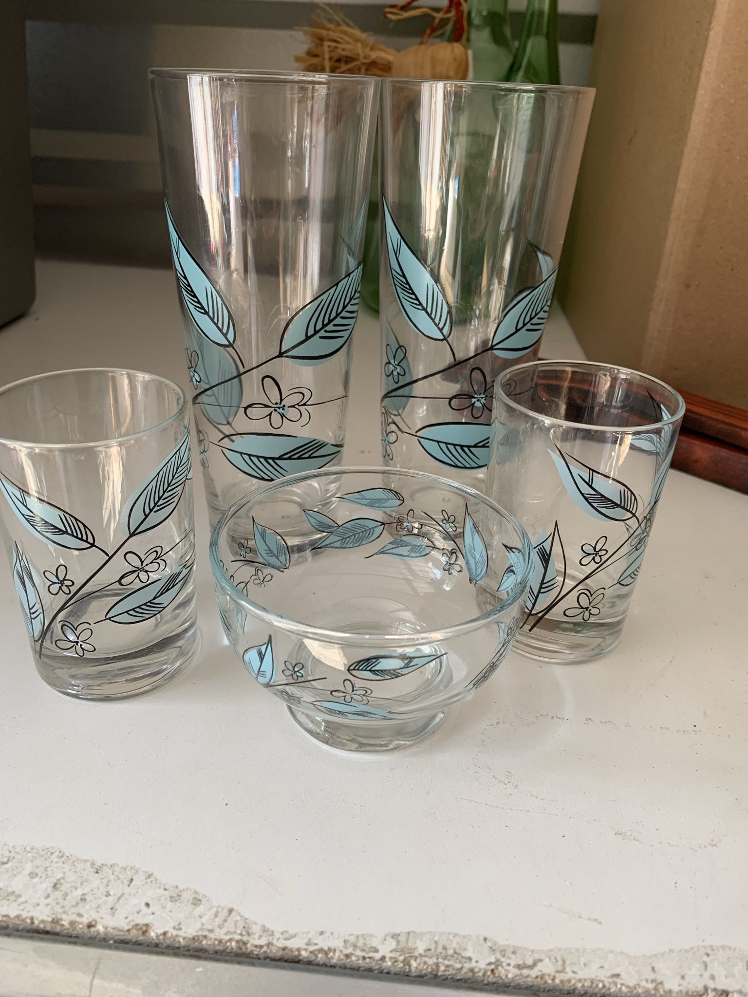 Vintage Biscayne Leaf Salem China 2 juice Drinking Glass, 2 ice tea drinking glasses, 1 sherbet bowl Turquoise Mid Century Modern 50s 60s