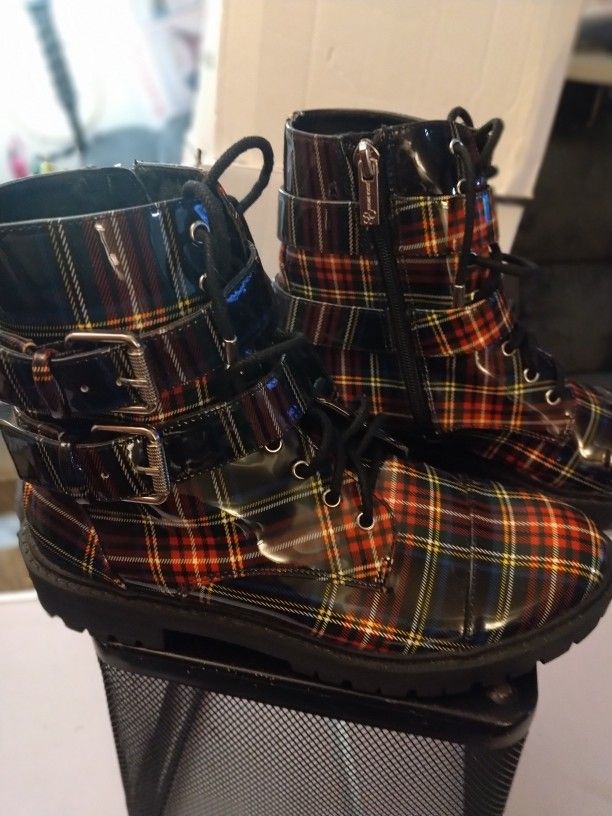 Basically new with no tags in excellent condition. Jessica Simpson Kerina lace-up combat boots in a red and black patent plaid material in size 7.5