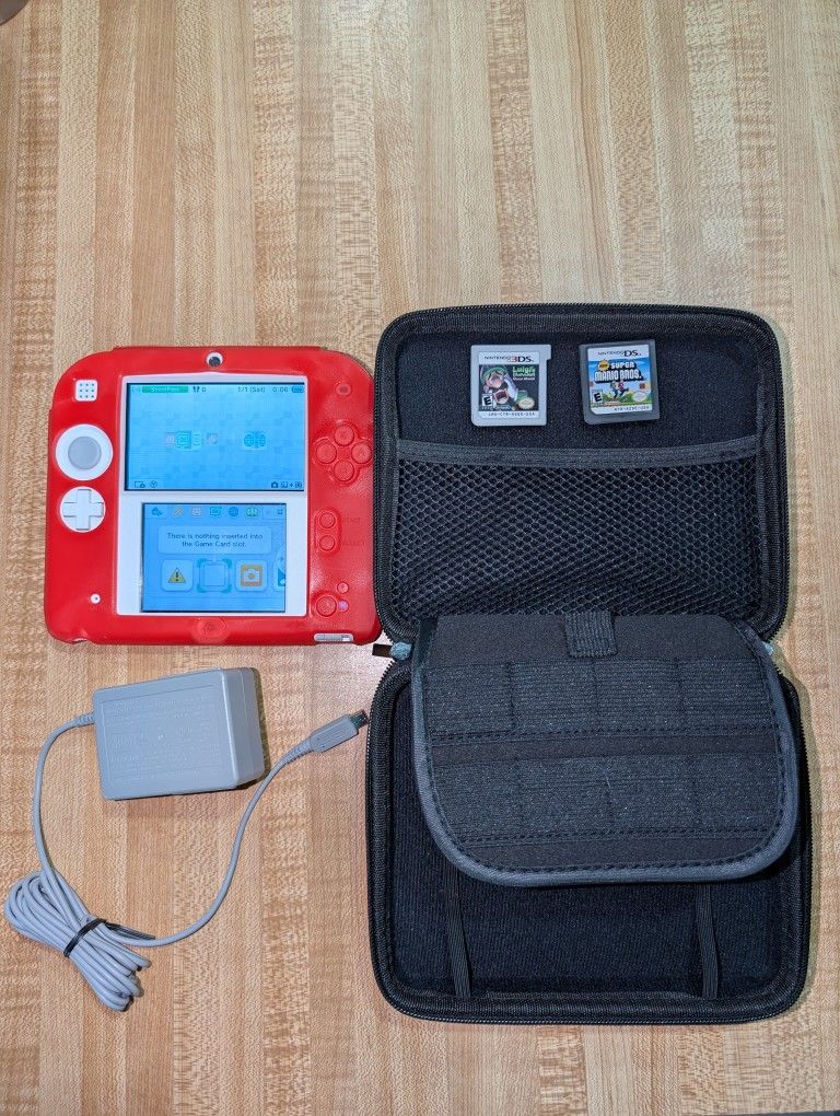 Slightly used Nintendo DS2. Comes with 2 games as pictured with a travel case and charger. Everything works. Only used a handful of times.