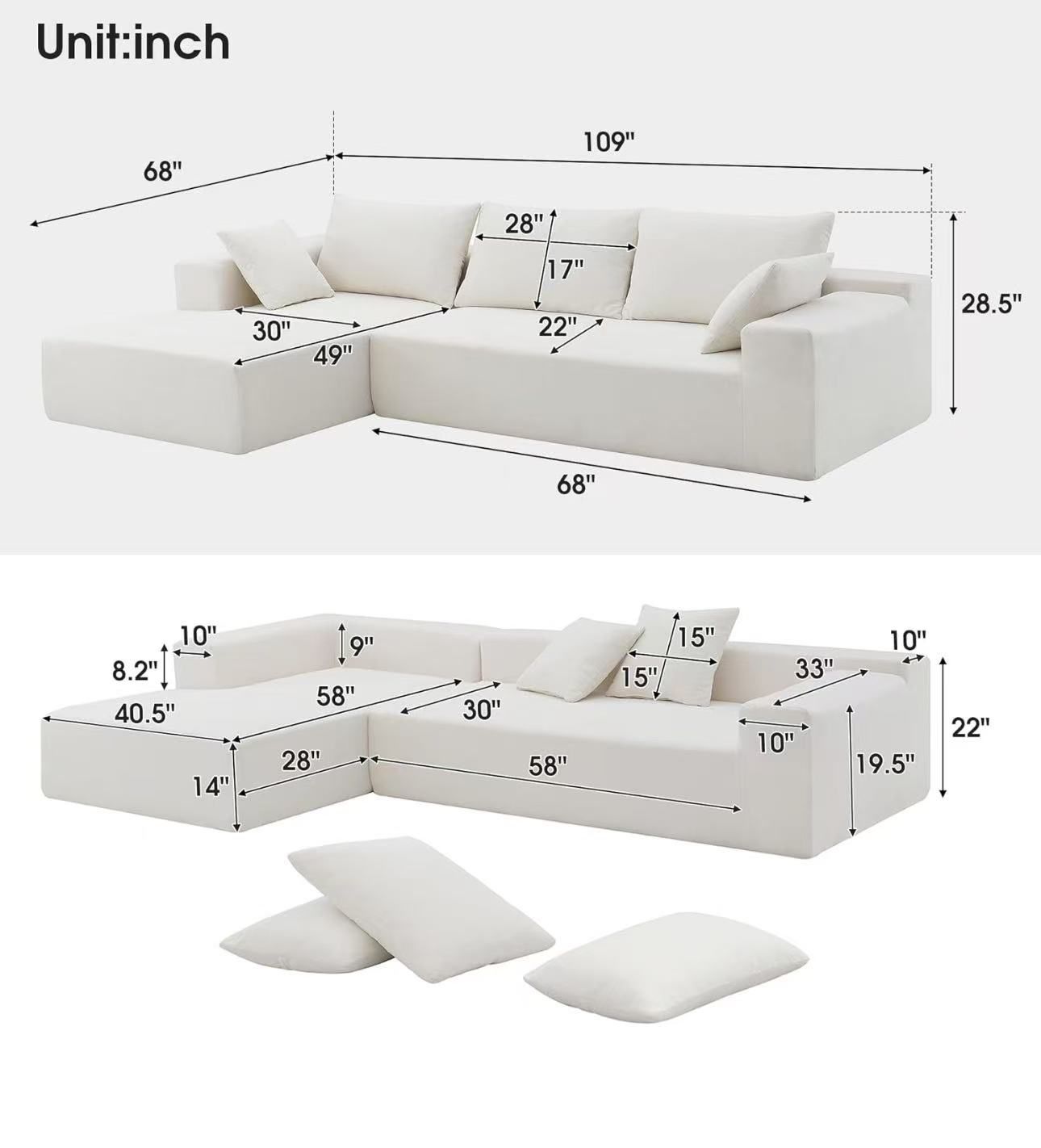 109" Sectional Sofa for Living Room, Modern Upholstered L-Shaped Sofa Couch with Chaise Lounge, Modular Sofa with Pillows for Home Office (White)
