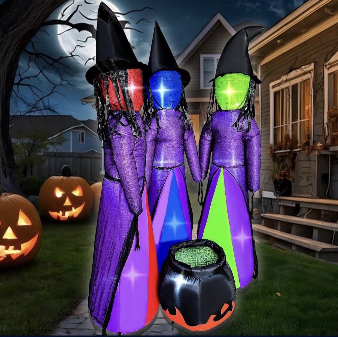 New open box Halloween Inflata... BLOWOUT FUN 6 FT Halloween Inflatables 3 Holding Hands Witches with Cauldron Blow Up Inflatables Halloween Faceless Witch Decorations with Build-in LEDs for Home Yard Lawn Garden Party Decor [Happy Halloween] : Greet your guests & trick-or-treaters with this 6 ft 3 Holding Hands Witches with Cauldron! The heads of 3 witches are red, blue and green, creating a realistic and scary atmosphere! It will definitely make your yard full of a scary fun atmosphere during Halloween season. [Built-in LED Lights] : Comes with interior LED lights to bring joyful vibes to your neighbors, friends, and family for extra holiday cheer; The lights make the witchs decoration look more realist,enhance the overall visual impact, making the inflatable even more mesmerizing during both day and night. [Multiple Usage Scenarios) : Whether you're hosting a Halloween party, decorating your front yard, or creating a spooky ambiance for trick-or-treaters, the 3 faceless witches with cauldron decoration is perfect for a range of usage scenarios. It will be a good decoration for your Halloween outdoor garden. [Easy to Use) The inflatables with a well-made built-in fan, you can inflate in a minute. Just put the inflatable witch on right place, zip up and plug it in, it will blow up and full soon,making your yard come to life effortlessly with our inflatable Halloween decorations!
