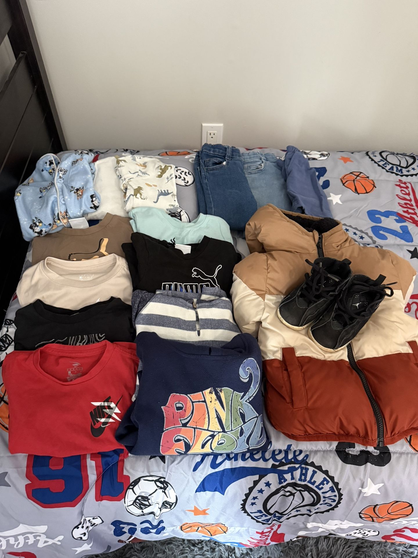 Toddler boy clothes. Sizes 3T. Comes with a pair of shoes (Jordan’s size 7.5), pants, puma shirts, sweatshirt, puffer jacket, pj sets.