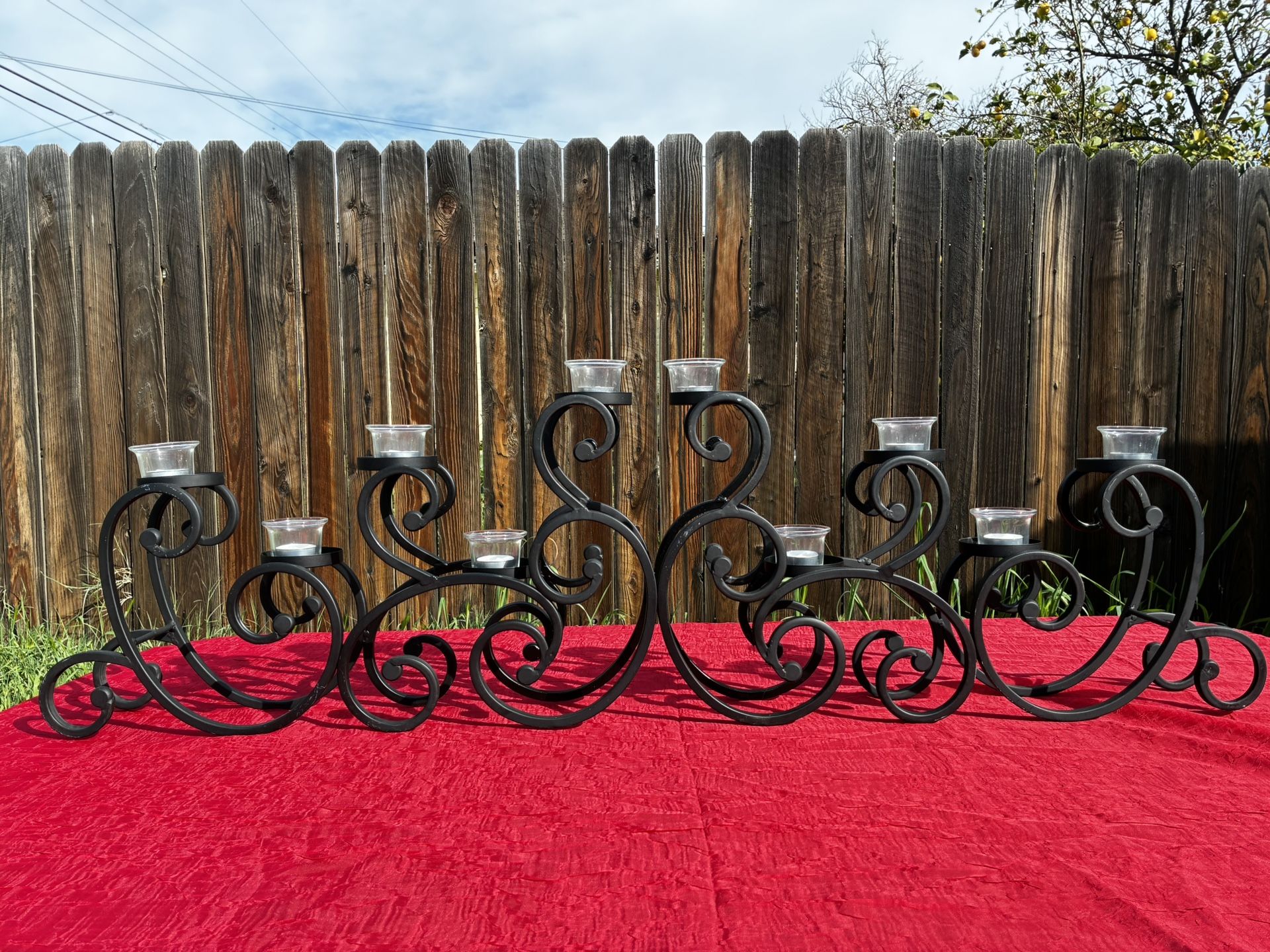 🟡Selling this Metal style candle holder set. It's got a cool scrollwork design and will include 10 glass votive cups . It's pretty long so it works great as a centerpiece for a dining table or on a mantle. The black finish is in good shape and it's sturdy. Perfect if you want that rustic or mediterranean look in your house. 🟡$30 or best offer .. no low low offers 🟡Pick up only !! 🟡Serious buyers only !! 🟡Only used for decoration.. 🟡see pictures for measurements 🟡has a few scuff marks from moving but nothing major .