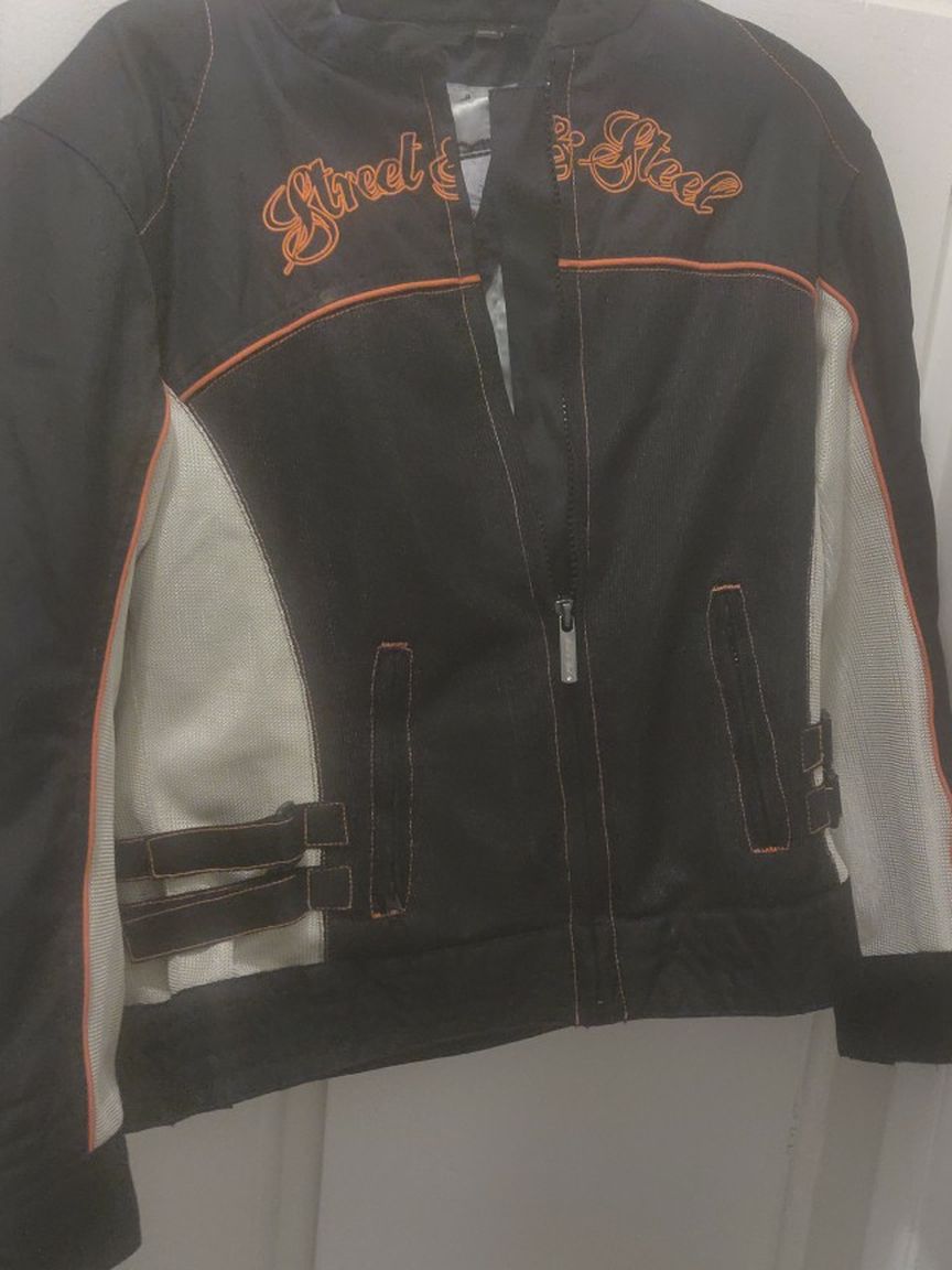 Near New Street & Steel Armored motorcycle Large women's Motorcycle jacket. Has a zip in sweater liner. In excellent shape. Used about 3 times my wife switched to leather jacket. Paid over $100 when purchased.