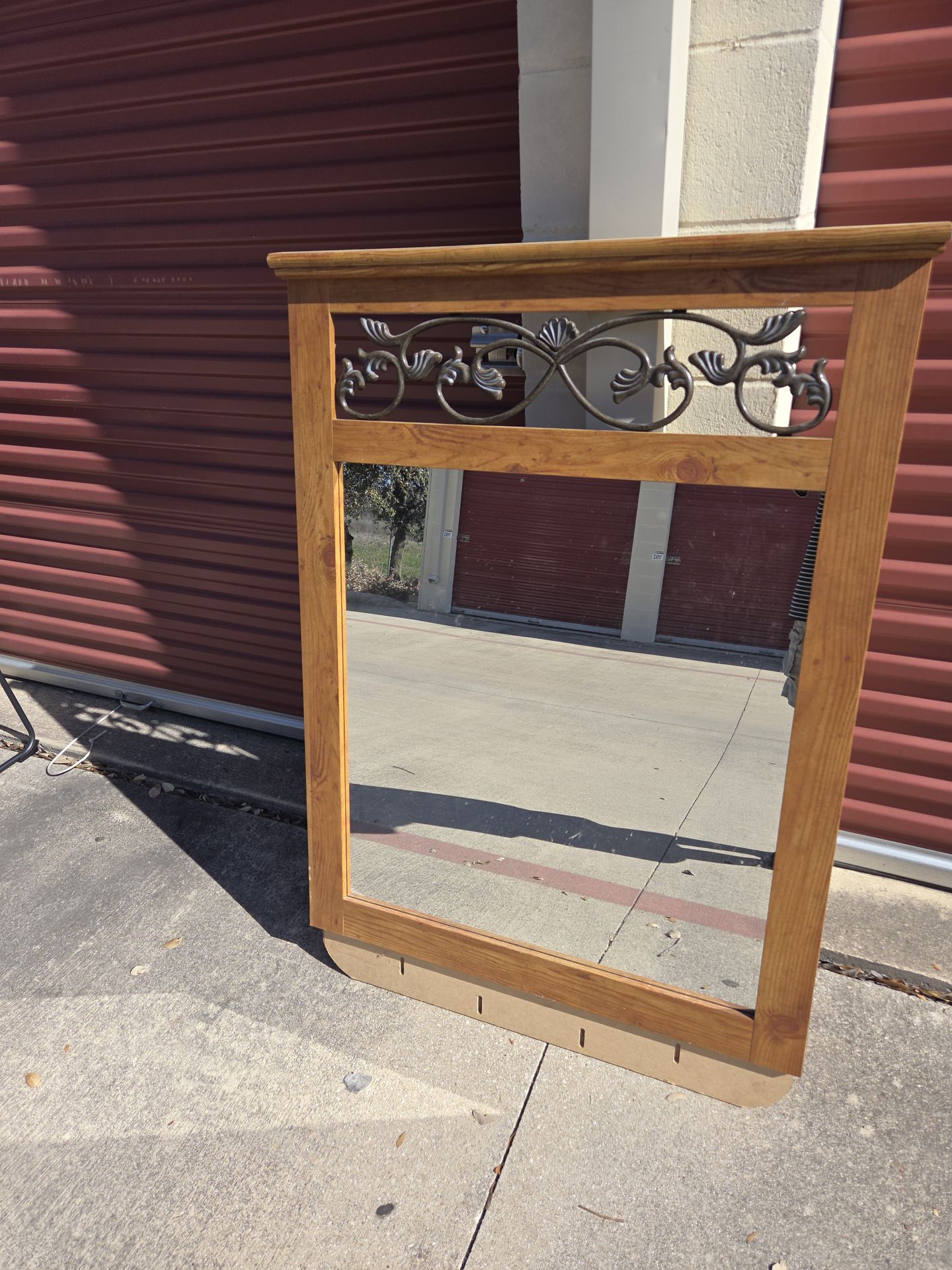 Mirror with frame is 47 in x 35 in Mirror alone is 32 in x 29 in Has holes on the bottom for attaching the dresser Metal decoration.
