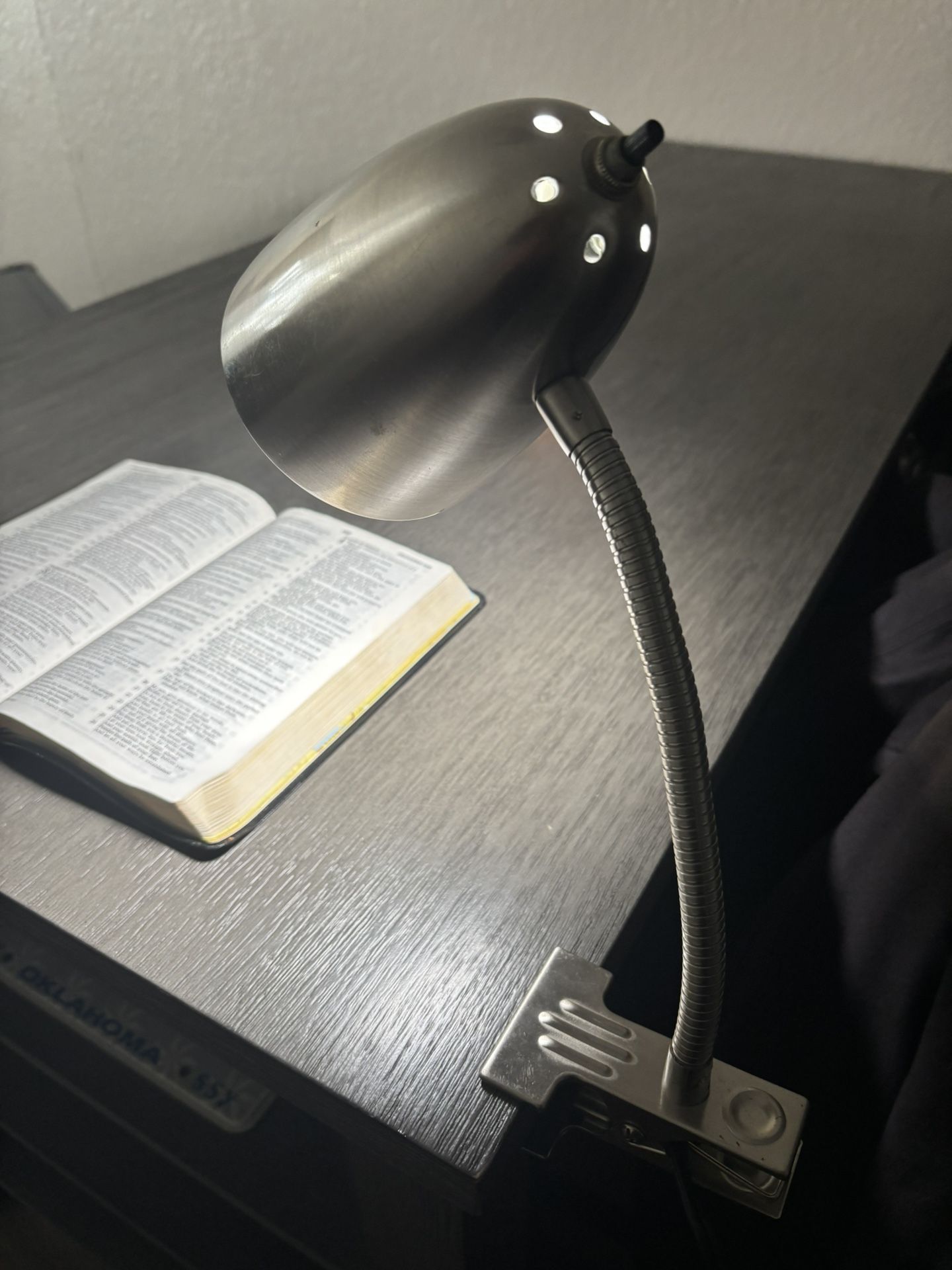 Bright clip-on lamp, perfect for desks, headboards, or shelves. Adjustable neck for directional lighting. Clean and fully functional. Easy pickup.