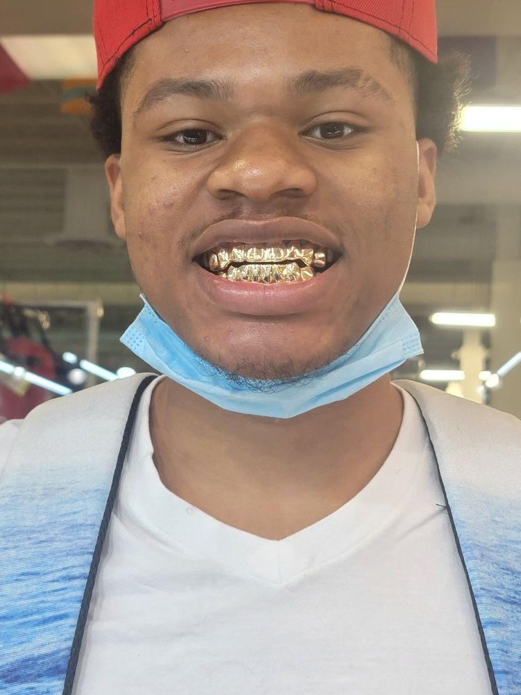 Customize your grillz!!!! Starting at $ 99.99 for 6pcs The one in the pic is 10k solid gold 8pcs top and 8pcs bottom $699.99 Broken teeth, missing teeth, gaps..... hide it with your customize grillz We make golds for your dentures as well!!!! 8k, 10k, 14k gold or sterling silver PULLOUT OR PERMANENT