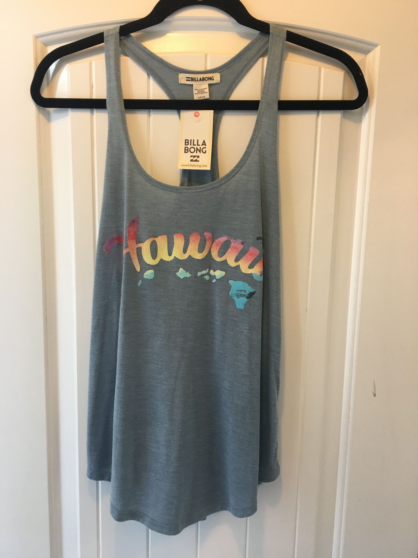 Billabong Razorback Blueish Grey Top with Hawaii and Hawaiian Islands in Rainbow Colors