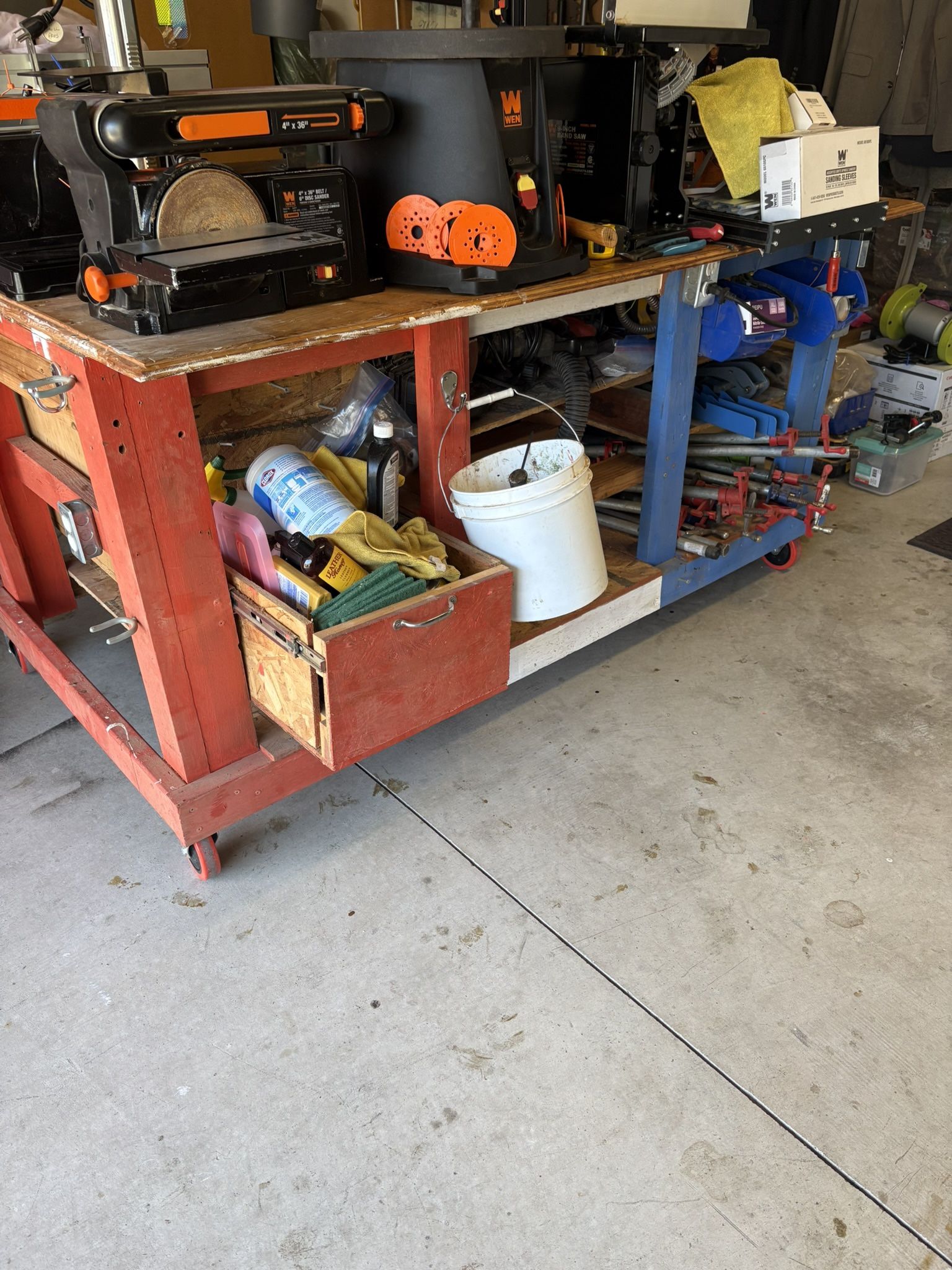 Hand made rolling work table. I have used it for several years doing woodworking.