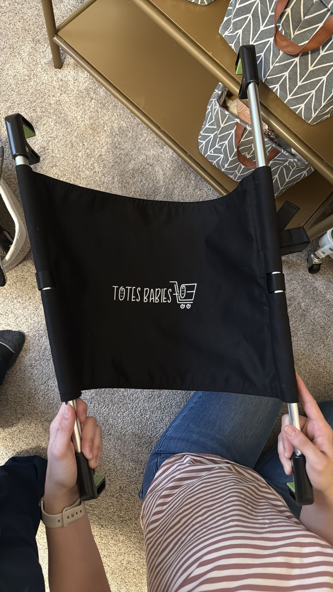 Perfect for any mom who takes their baby in a car seat and needs more room in the cart. Fits in any size cart, even costcos. Has the car seat hang in the air and allows more space in your cart. Buckles for safety!