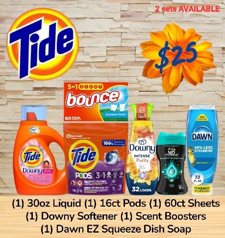 π₯π₯ Tide LAUNDRY DETERGENT Household Starter BUNDLE π₯π₯ β β $25 Set β β (2 SETS AVAILABLE) EACH SET INCLUDES: β (1) 30oz Liquid Detergent β (1) 16ct Tide Pods β (1) 60ct Bounce Sheets β (1) Downy Softner β (1) Unstoppables Beads β (1) Dawn Dish Soap Pick up ONLY Tempe, Az
