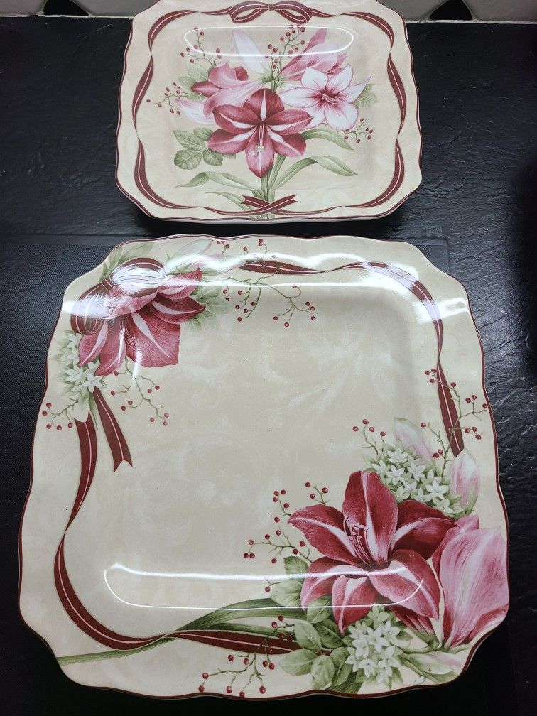 I have 6 of the large holiday plates which are 11 inch square and 3 of the small plates which are 8 3/4 in square. These are brand new and have never been used. Would make entertaining more festive. From a smoke-free pet free home. Please click on my profile to see all of my other goodies. Thank you for looking and have a great day.