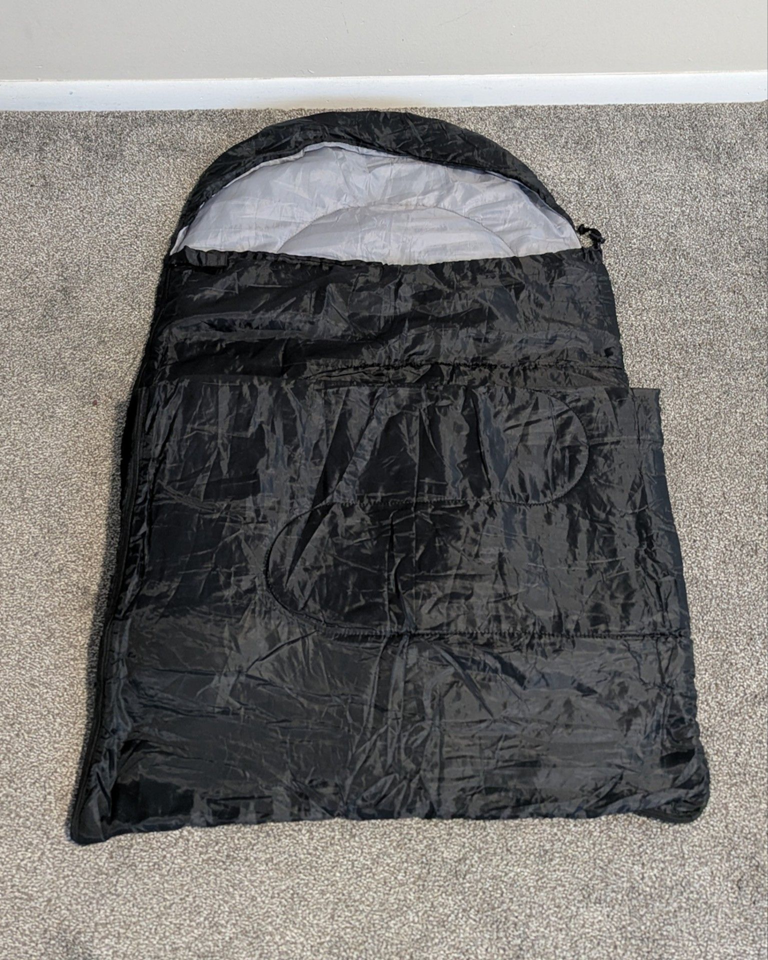 Light synthetic sleeping bag. Comfortable down to low 50s. Large rectangle shape with hood. Only used once.
