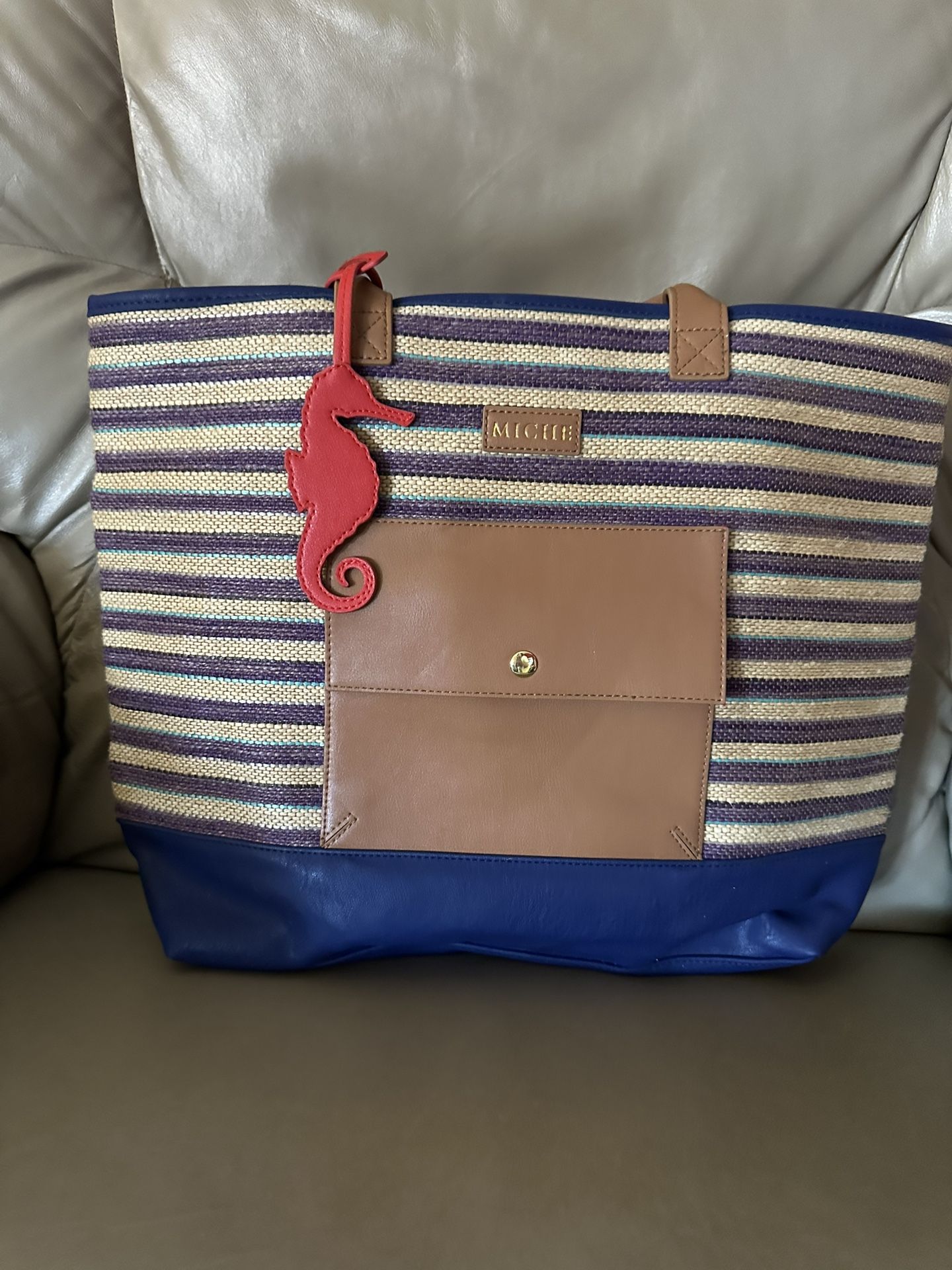 At the beach, at the pool, at the park or at the zoo, this tote is the must-have accessory for all your summertime adventures. Sturdy woven fabric in a tan and navy striped pattern is ready when you are. The fun in this design is in the details—fine aqua stripe accents, nautical navy faux leather in all the right places, and even a red seahorse key fob. Flat front pocket in coconut brown and matching debossed logo complete the look. The inside is lined with bright red cotton-blend fabric and features a handy large zippered pocket. Bag is completely self-contained—it is not interchangeable like our traditional bags. Gold hardware. Tote dimensions: 13 ¼” long x 13 ¼” tall, with a 4” gusset. Handle dimensions: 22” x 5/8”, with a 7 ½” drop.