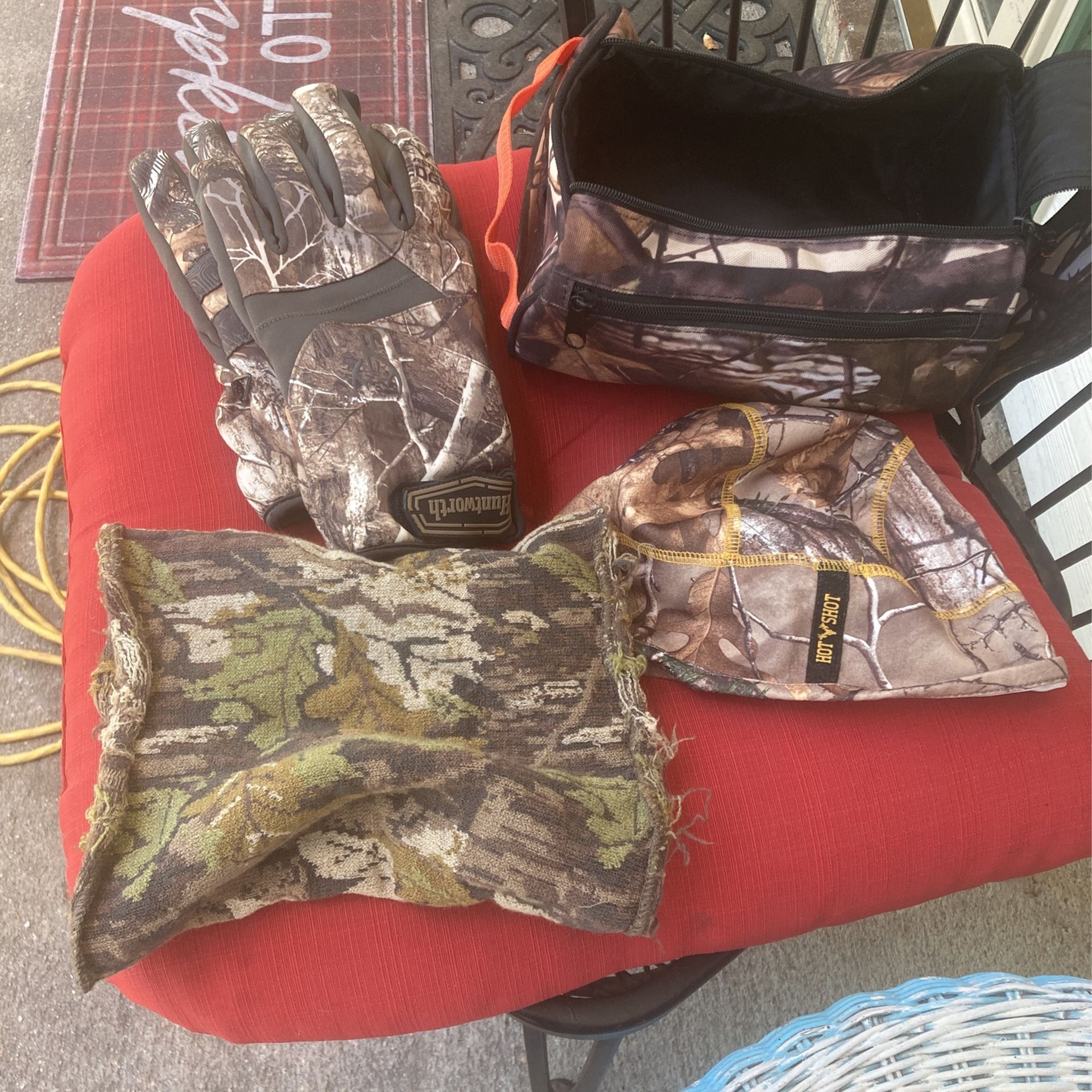 Camouflage Gear In Bag Gloves, Hot Shot, Beanie, And and neck warmer