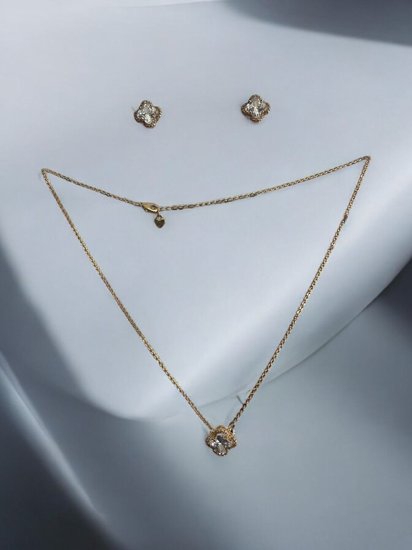 Clover style cz stone pendant necklace and earrings set Material is environmental copper 18k gold electroplated and cz stones Set of necklace is 17 inches pendant is 1/2 inch x 1/2 inch earrings are 1/2 inch x 1/2 inch Hypoallergenic