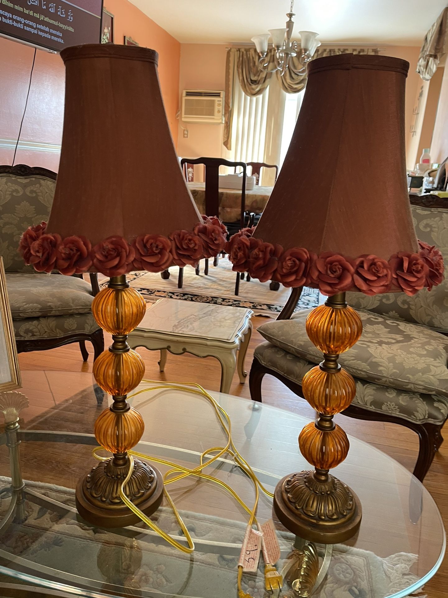Vanish set of 2 Victorian style Amber glasses three roll for each one include art Glass size28.5”L/12” the meter Striped fabric shirt include flowers of age red colour shade including METAL easy to use control of power you can’t using three ways lamps. Use the like New is very good conditions. You can’t follow all the photos thank you you Visit my list if you have any questions you can contact me.