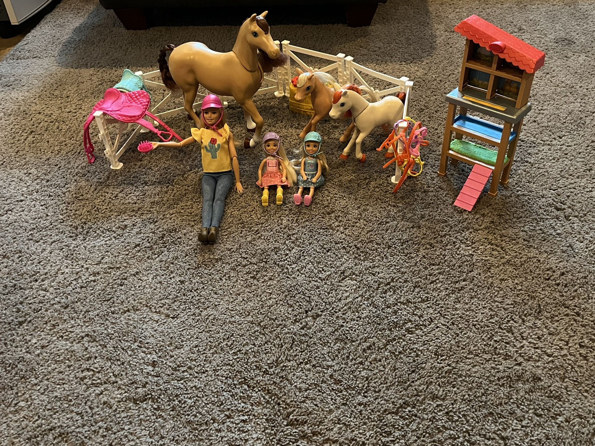 Barbie Playset with Barbie and 2 Chelsea Blonde Dolls, 2 Horses with Bobbling Heads and 1 additional horse, Accessories that Include Corral Fencing, Feeding, Grooming, Nurturing and Horseback Riding Pieces