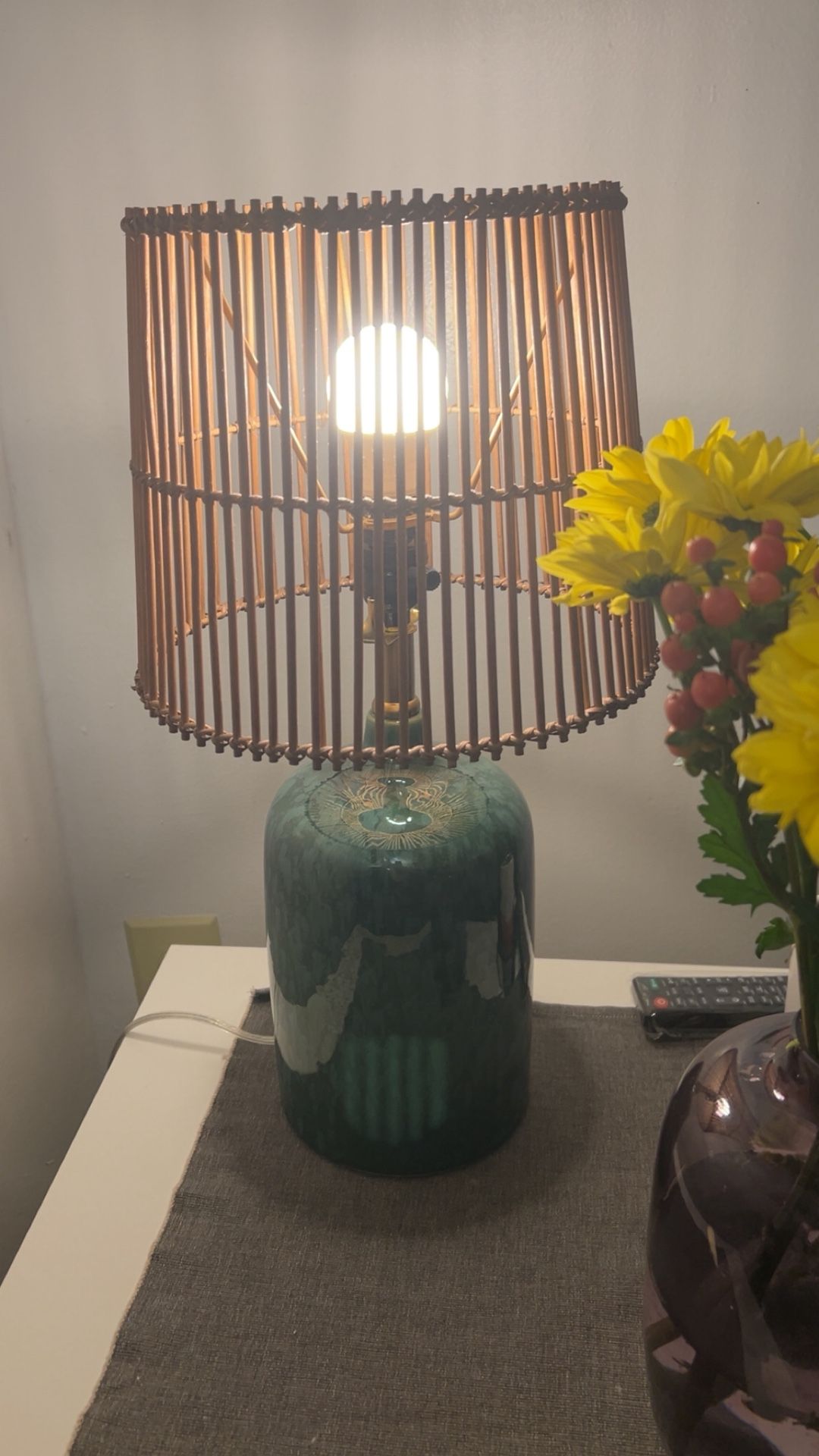 Brand new ceramic table lamp with wicker umbrella dark green color .