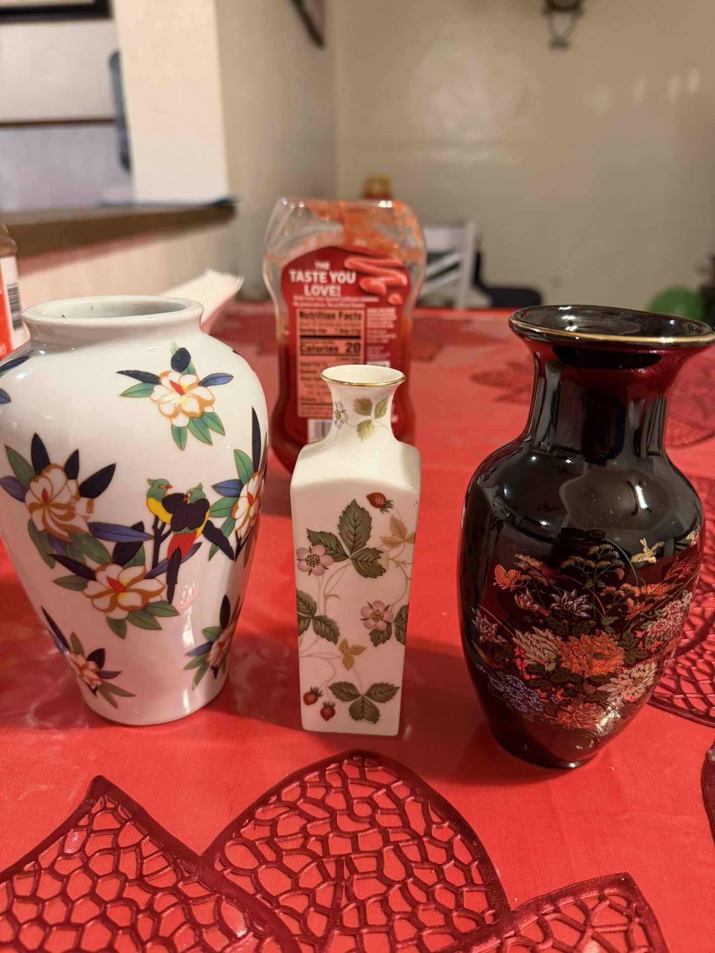 vintage Japanese floral vase with/ hummingbird 6-1/2 tall black/gold, Vintage Small Porcelain Vase Depicting Flowers and Colorful Birds 6-1/2” and Bud Vase Wedgwood Wild Strawberry 5-1/2”. $150 for all 3 or best offer