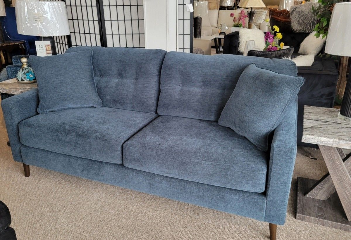 High-resiliency foam cushions wrapped in thick poly fiber Navy Sofa 79" W x 38" D x 37" H Loose non-reversible seat cushions Local Free Euroclassic offers quality bedroom, living room, and dining room furniture at OUTSTANDING PRICES. Accent pillows included Free to your Home! A Portland Tradition Trusted For Over 80 Years Attached back cushions with button tufting