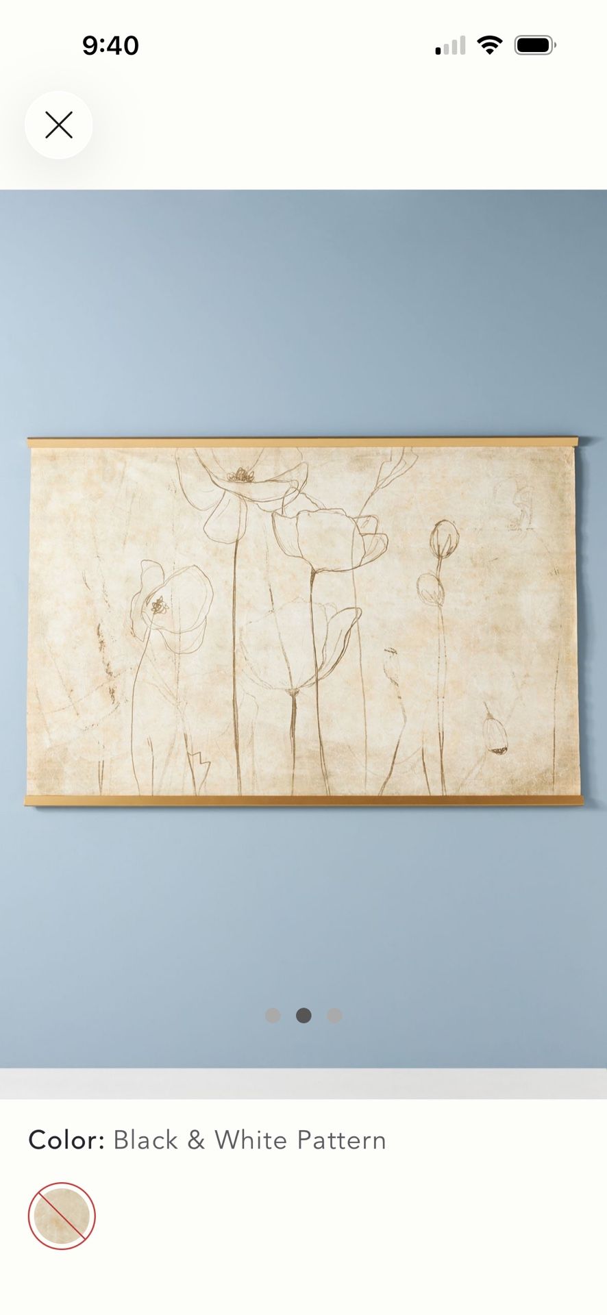 Beautiful oversized poppy flower tapestry with a soft, neutral background and simple line-art design. It adds a calm, modern look to any living room, bedroom, office, or hallway. $150 or best offer Size: • Height: 59.75” • Width: 86.75” Details: • Lightweight hanging tapestry with wooden top and bottom bars • Neutral tones that match almost any décor • Large statement piece for a big wall • Easy to hang In great condition.