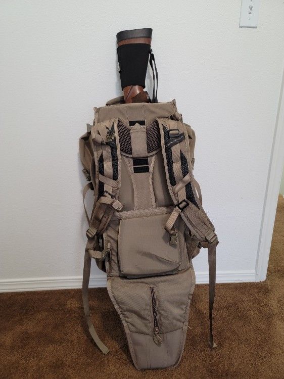 G3 phantom snipers backpack MOLLE compatible racks inside and out, and a fold-down shelf that can be used to divide the main compartment into upper and lower chambers. It will carry two 3 liter hydrration kits mounted in side pockets, and/or two 2 liter bladder in sleeves between the side pockets and the main pack. Includes the pack and scabbard combination, removable butt-cover, and a pull-out rain cover This backpack in used condition Total volume of 4700 c.i. Pack Volume: 2,200 c.i. Scabbard Volume: 600 c.i Total Volume: 2,800 c.i. Weight: 10 lbs 5 oz Dimensions main bag: 24"h x 11"w x 7"d Scabbard Dimensions: 34"L x 10"W x 3"D, with a 26" circumference opening
