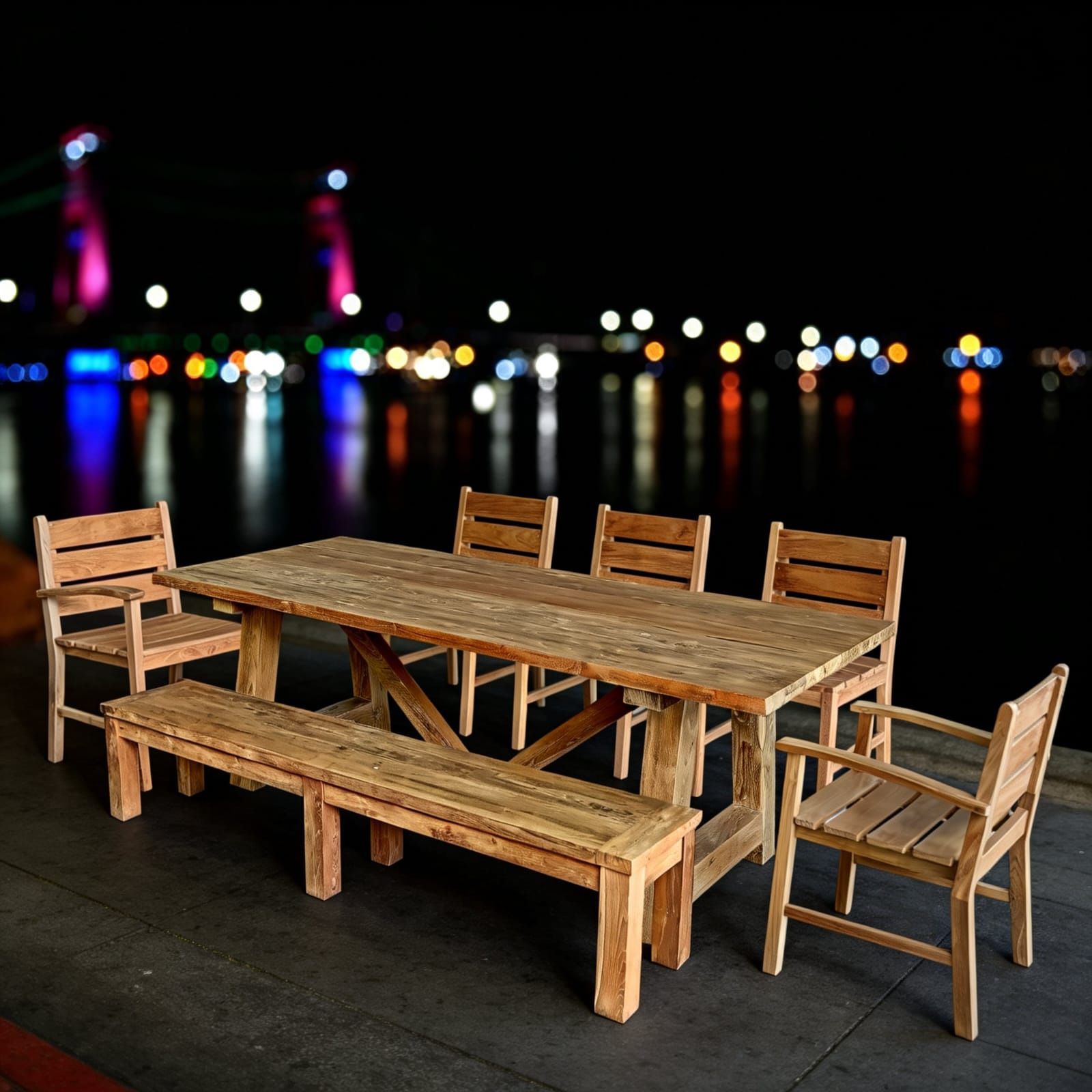 Brand new in the box. Simple assembly required. Teak table and teak bench is solid reclaimed teak wood and extra heavy duty. Table is 39x94” Bench is 79”, big enough for 3 5 teak armchairs. Total 7 pieces, firm and final $ 4,550 Specializing in commercial teak outdoor furniture for purchasing agents, interior designers, landscape architects, landlords, building owners, home staging, resellers. Teak outdoor furniture, patio furniture, wooden chair, wooden table, wooden bench, patio seating, tennis bench, airbnb, drop ship