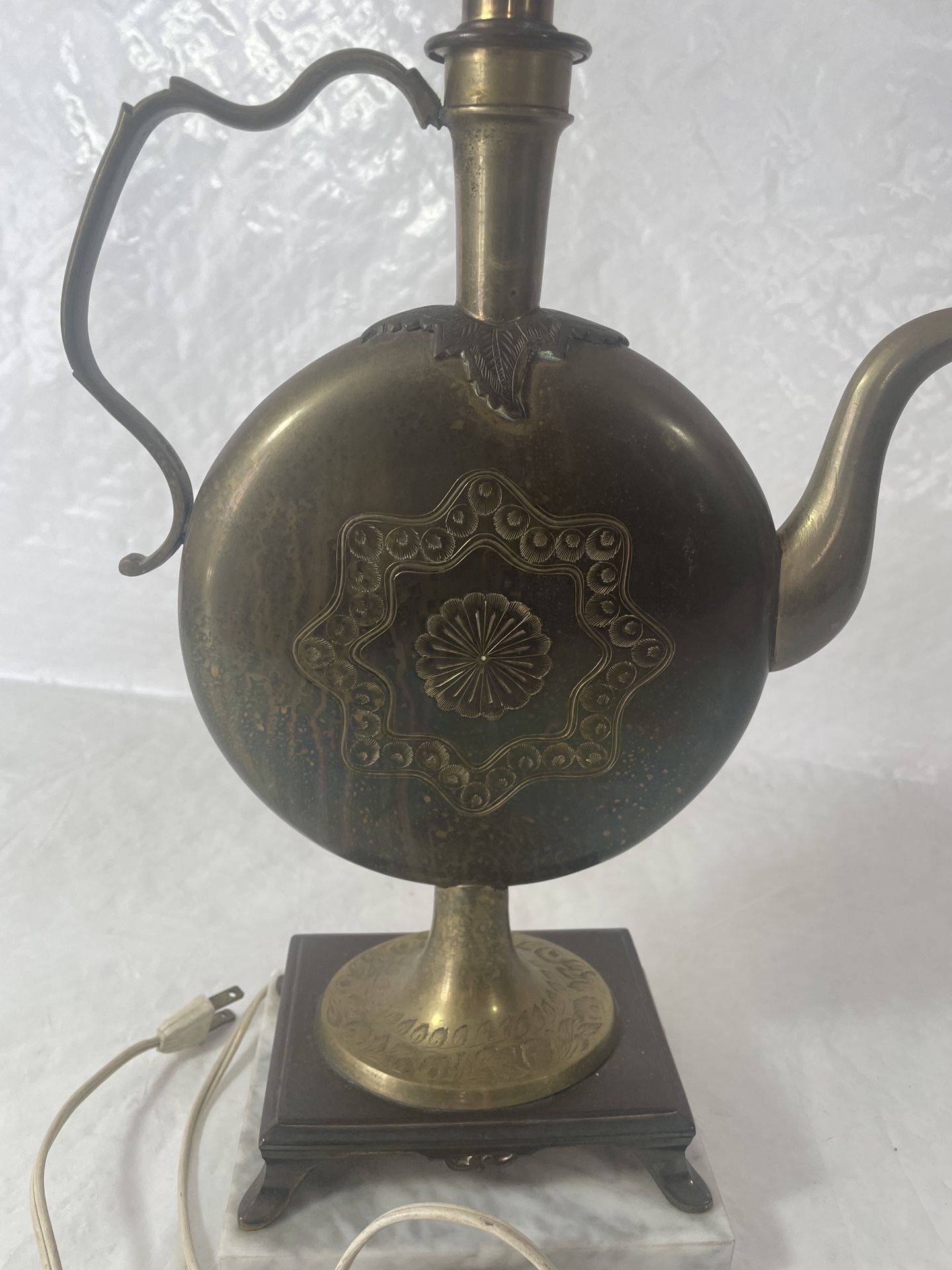 This is an unusual lamp in the form of a middle eastern water vessel. It is on a marble base and the form has intricate etched in designs. (See photos). condition: Excellent. dimensions: tall: 20". Widest: 10". Base: 5" x 6 1/2". Free personal pickup in Aventura. Cash and carry