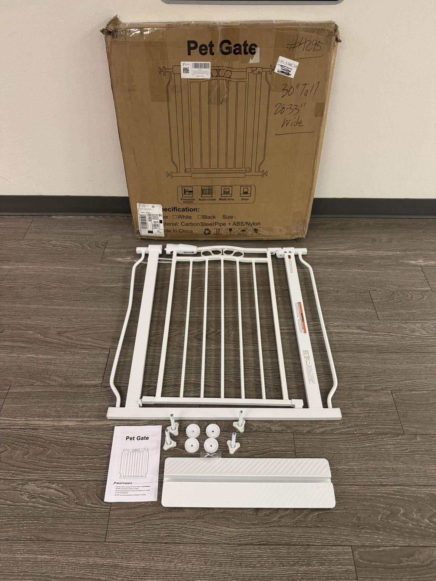 I have lots of gates in stock This is a brand new safety gate Excellence for a 28 or 30 inch door Perfect for kids baby pets dogs (30” Tall x 28-33” wide) Pressure mounted All complete - ready to install $20