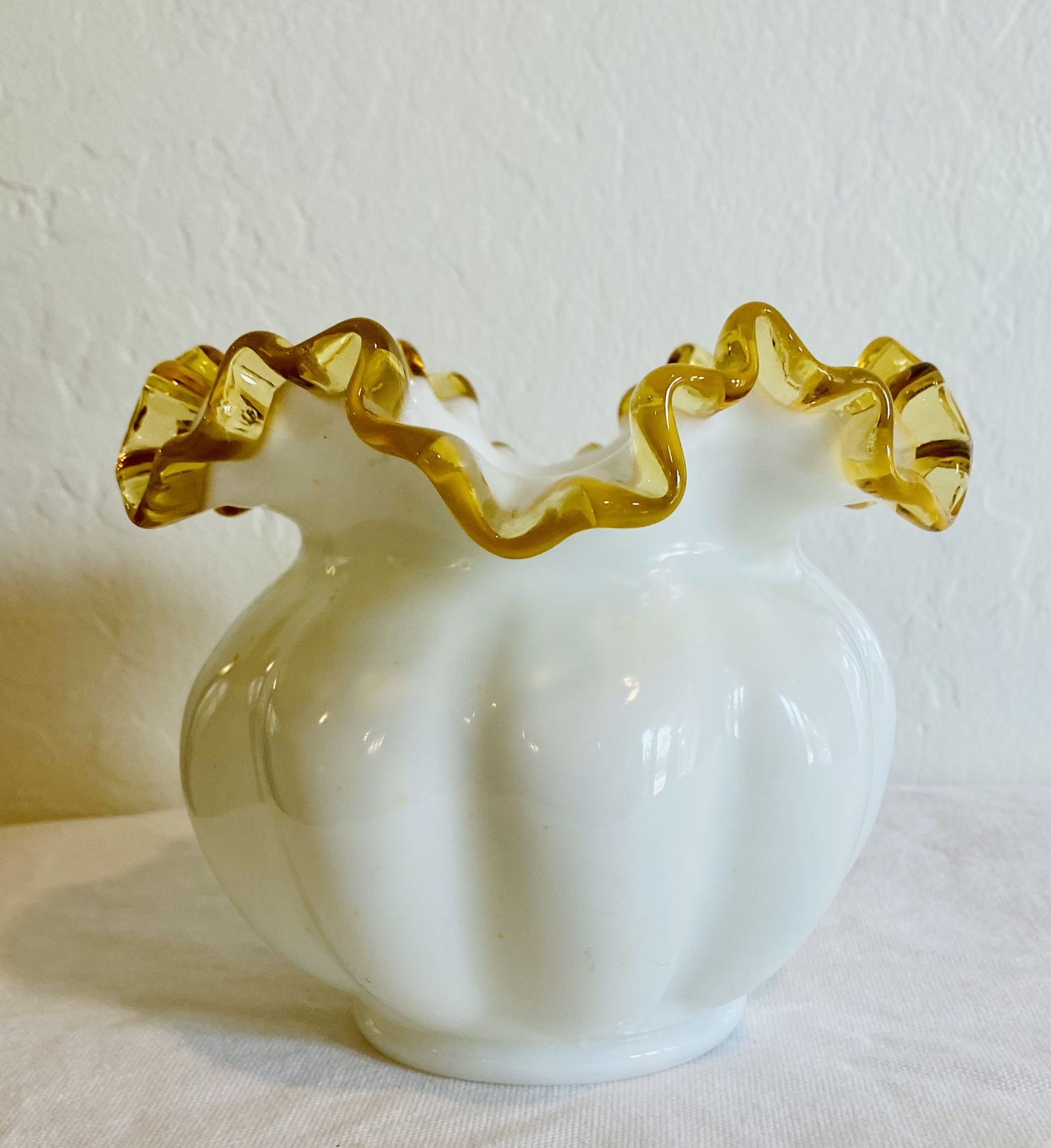 no chips or cracks ANTIQUE FENTON MELON SHAPE TOPAZ CREST MILK GLASS ROSE BOWL - 5 1/4” HIGH vintage retro collectible mid century modern mcm art glass colored glass vase flowers farmhouse See less