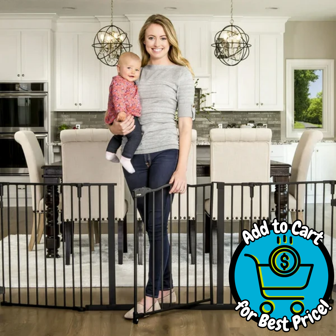 The versatile Regalo Home Décor Super Wide Baby Gate is an essential tool for homes with an open floor plan or unusually shaped or angled openings. The safe and convenient gate stretches to fit a variety of openings and is a unique way to protect both your child and home. Made of an all-metal construction, the black décor gate can be arranged a variety of ways. Spanning to fit odd shaped openings from 56” up to 74” wide. Easily mounting to the wall, the convenient gate features a large walk-through door designed with a three-lock system for added security.