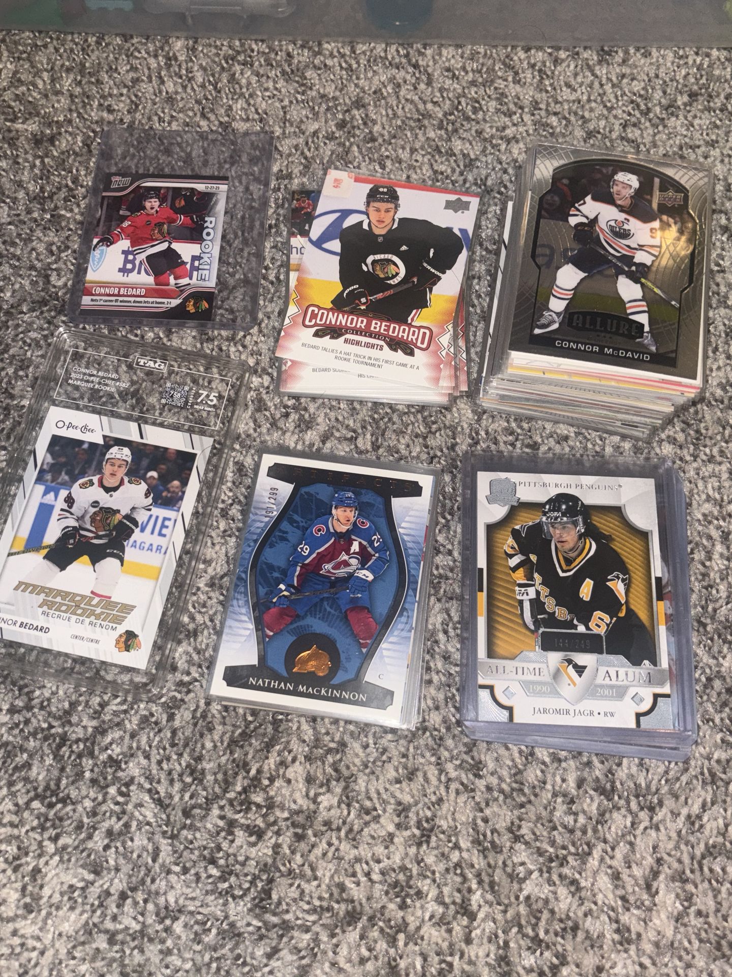 I know nothing about hockey cards this is being sold for someone. Mix of cards from various teams lot of Connor bedard and mcdavid cards, as well as numbered cards and rookie cards